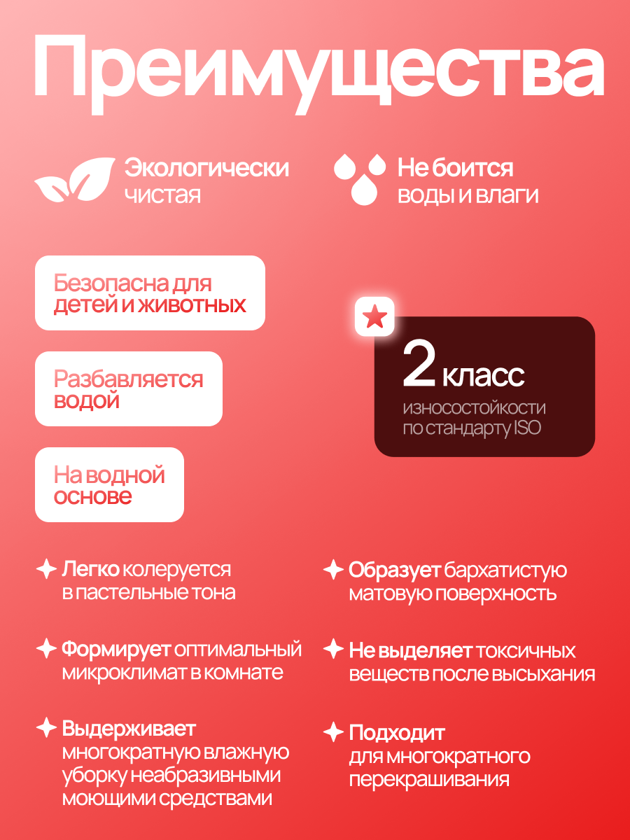 Краска не имеет запаха, что делает ее безопасной для использования в детских комнатах и помещениях, где требуется отсутствие вредных веществ.