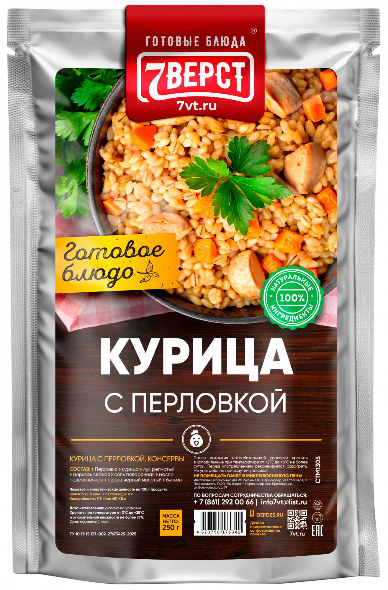 Перловка, филе куриное, лук репчатый свежий, морковь свежая, соль поваренная, масло растительное, вода, специи (кориандр, горчичный порошок, паприка красная молотая, чеснок молотый, орегано, сумах, перец красный чили молотый, мука рисовая, перец душистый молотый, лавровый лист молотый, черный перец молотый, петрушка сушеная), соус кулинарный.