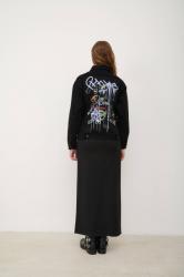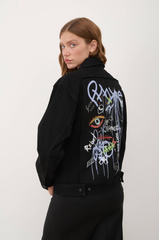 Женская джинсовая куртка прямого укороченного фасона, с застежкой на пуговицы под отложной воротник. Традиционные нагрудные карманы с клапанами, прорезные карманы по бокам, манжеты на длинных рукавах. На спине - яркий принт мультиколор. Такая куртка из денима станет имиджевой в гардеробе, добавляя "изюминку" повседневному выходу и с легкостью комбинируясь как с футболкой и джинсами, так и с платьями или брюками и топом.