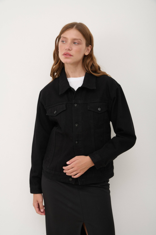 Женская джинсовая куртка прямого укороченного фасона, с застежкой на пуговицы...