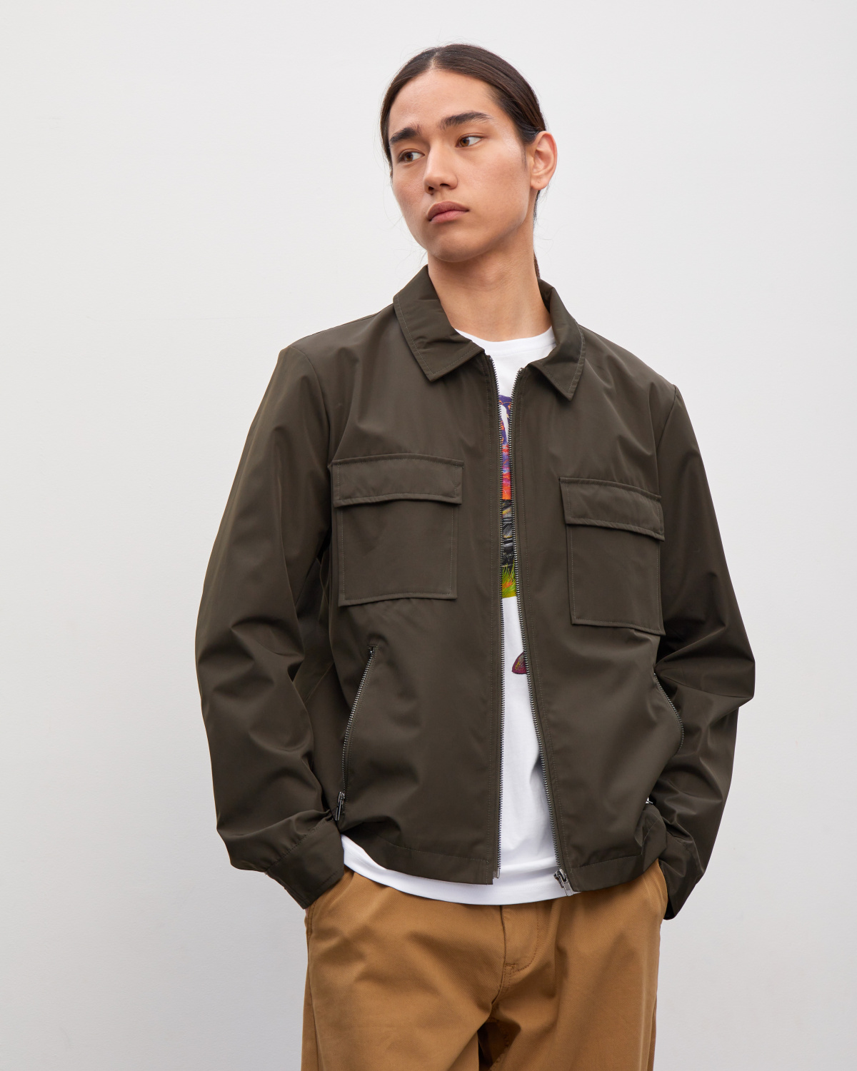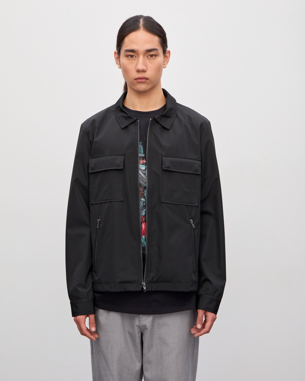 Куртка мужская, прямого кроя, с отложным воротником и застежкой на молнию, с накладными карманами с клапанами на груди. Модель из полиэстера однотонного цвета.