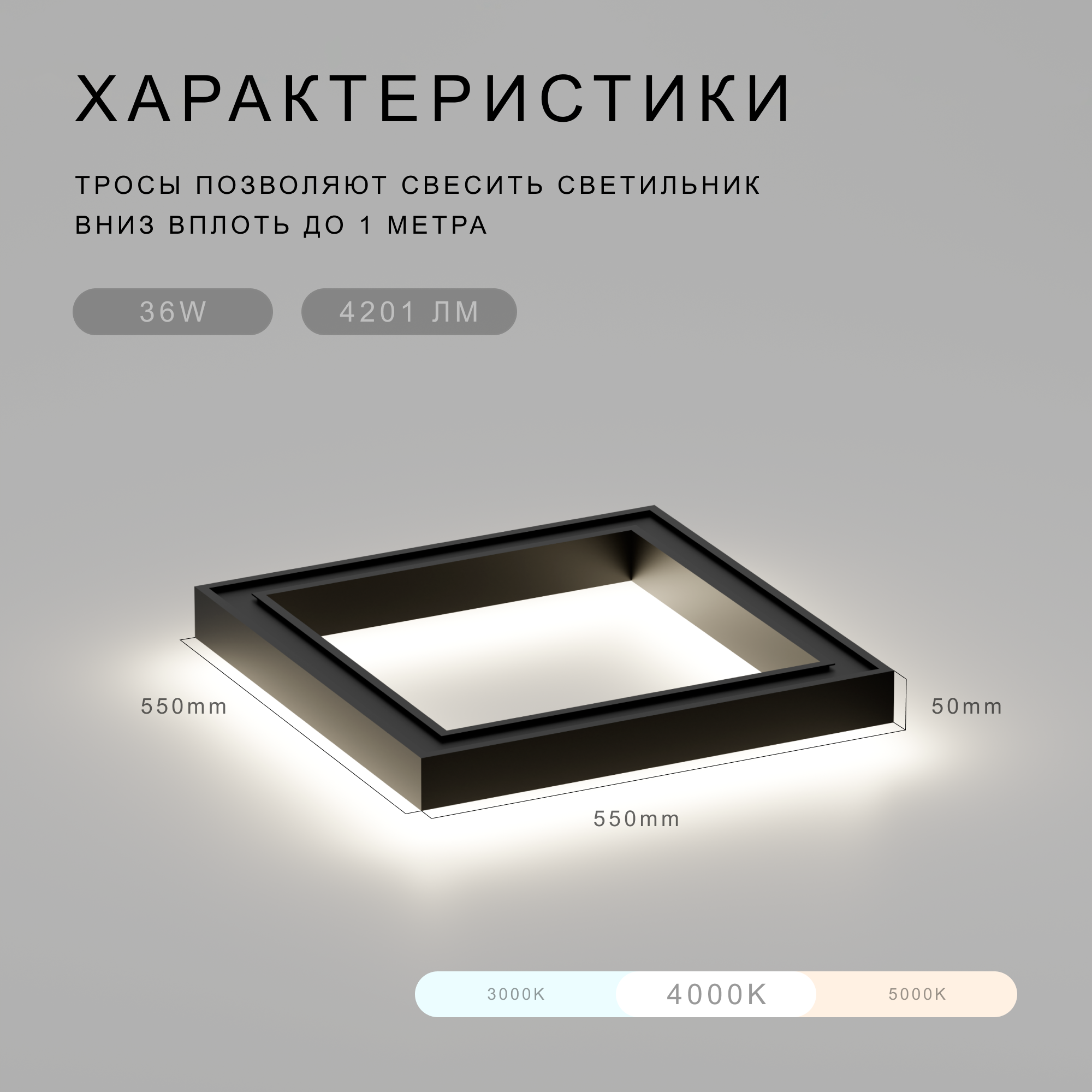 Квадратный универсальный светодиодный светильник, 550*550*50 мм, 4000 К, 36 W