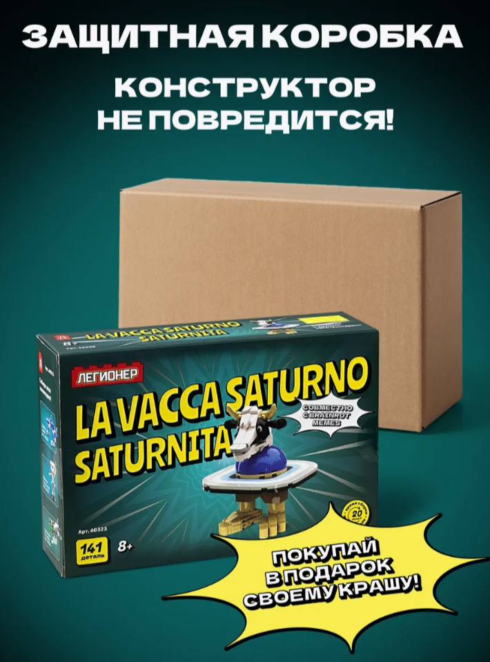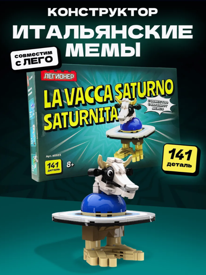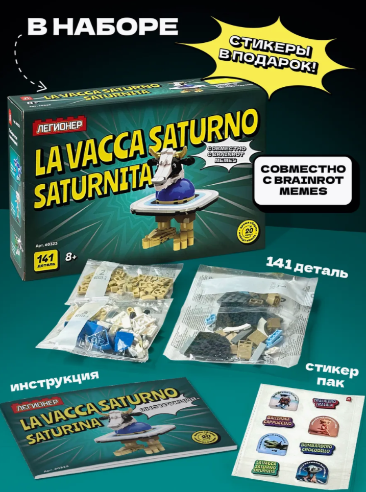 141 деталь, чтобы собрать ульт итальянских мемов эпохи Тралалеро Тралала. Вака — серый кардинал, но всё перевернулось, когда Вака Сатурнита запустила кибер-апокалипсис. Теперь она главная в руинах старого мира и ищет выход из матрицы, наверное.