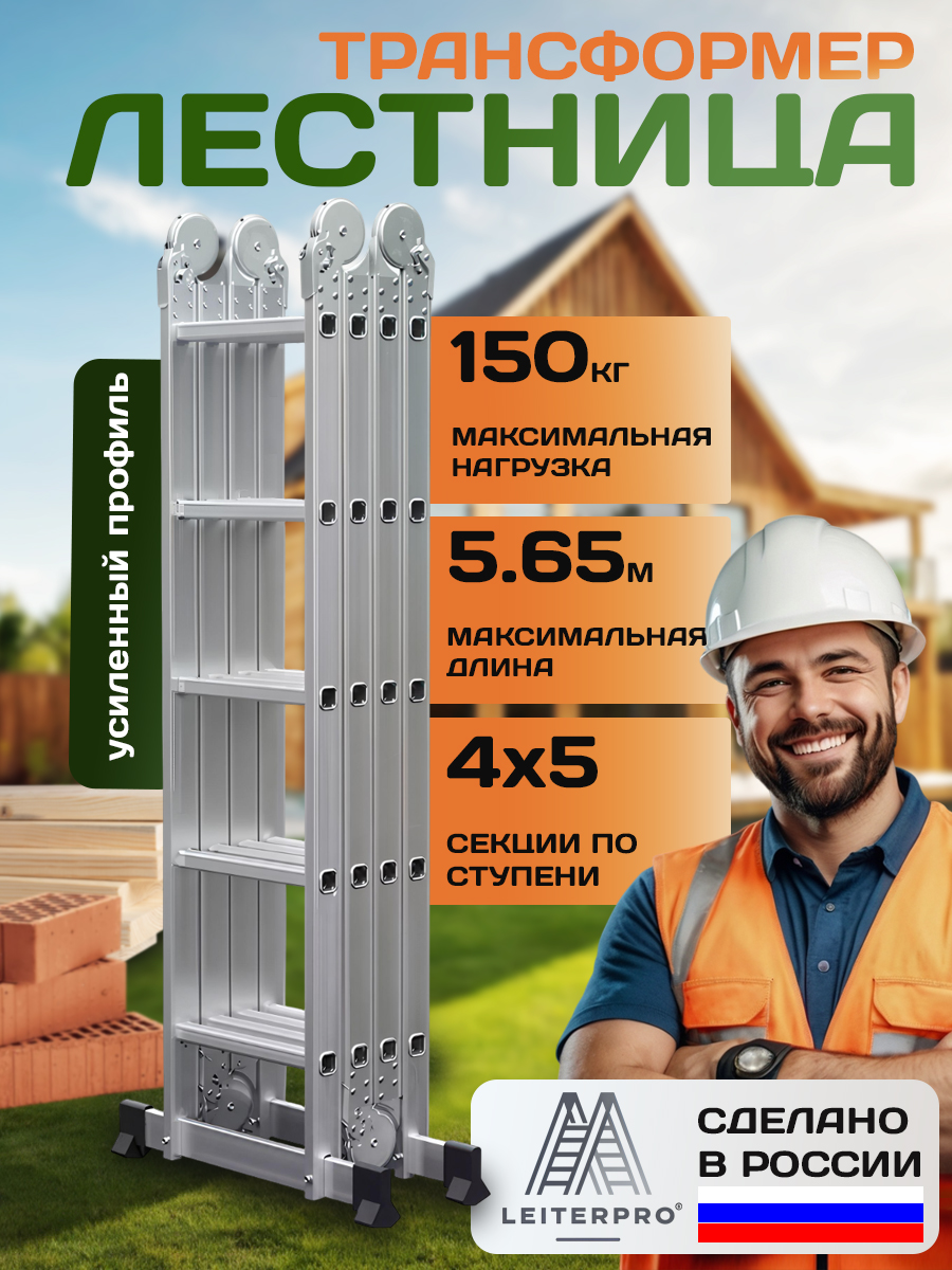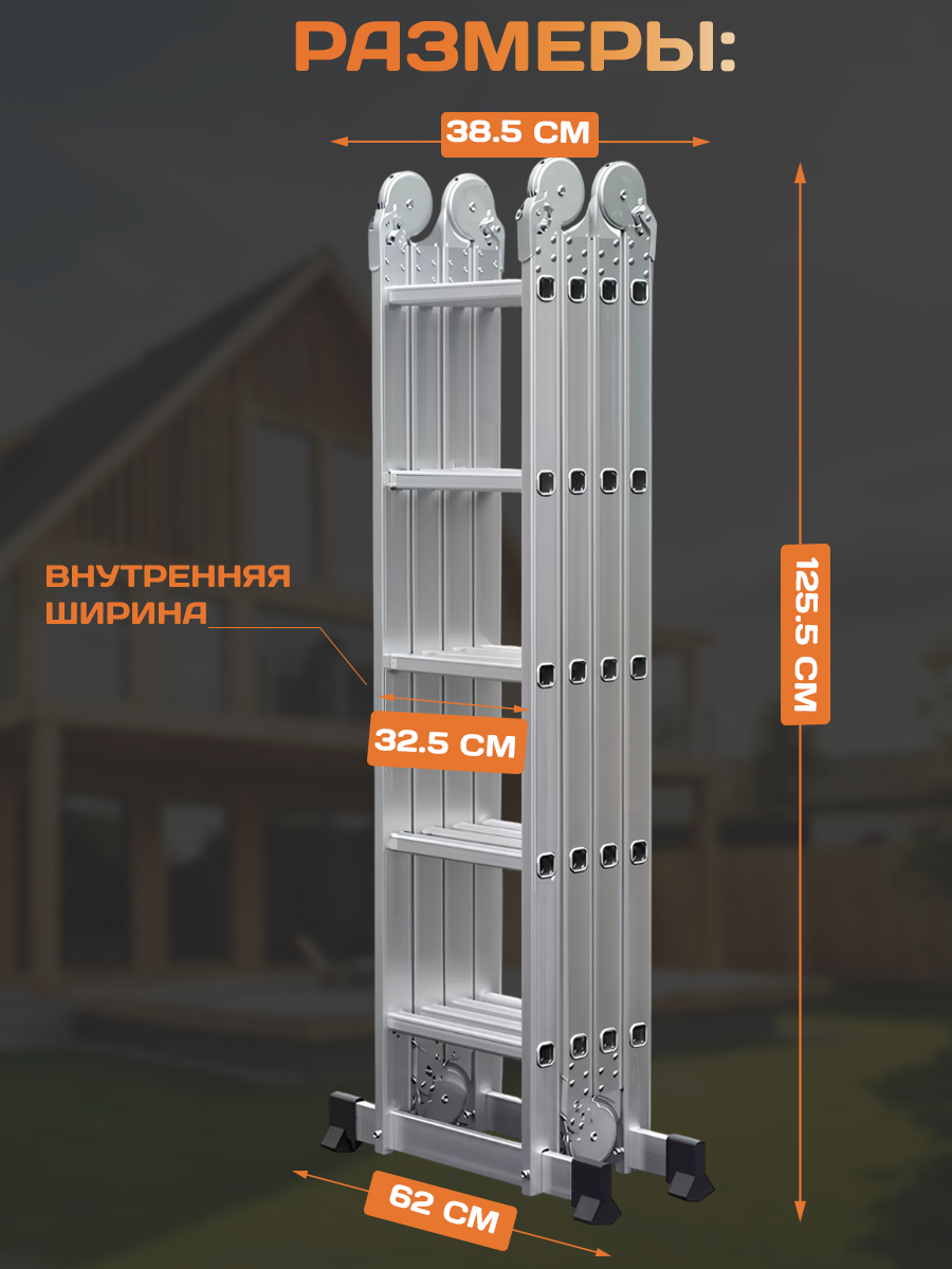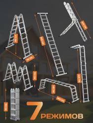 Лестница состоит из четырех секций, соединенных между собой увеличенными стальными шарнирами с различными углами фиксации. Большой размер шарнира позволяет использовать лестницу в любом из возможных положений с нагрузкой 150 кг.