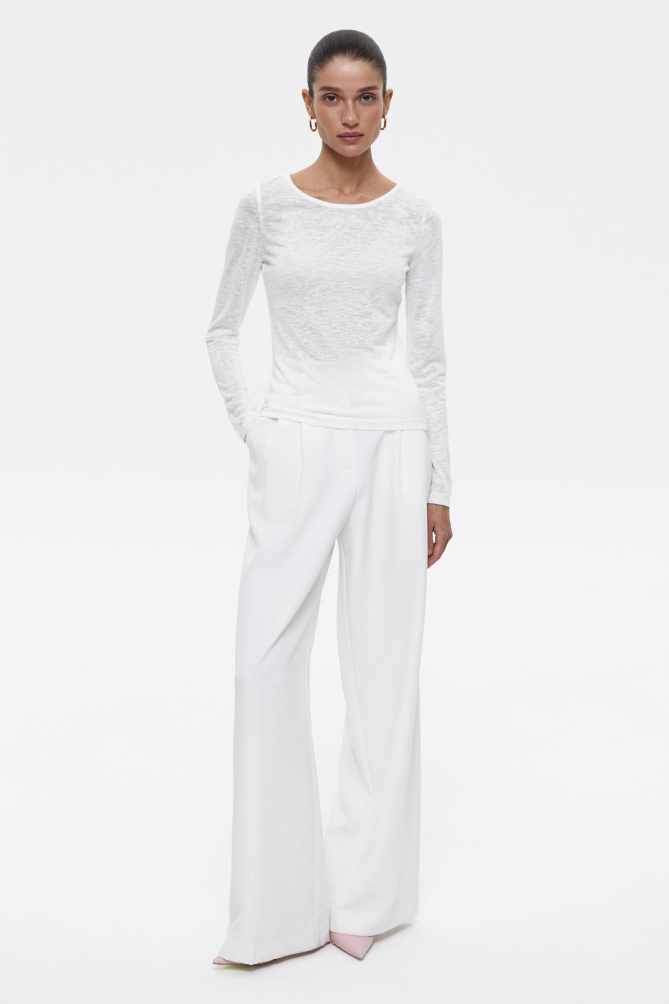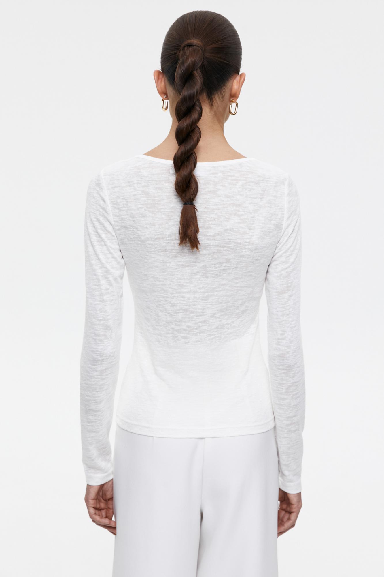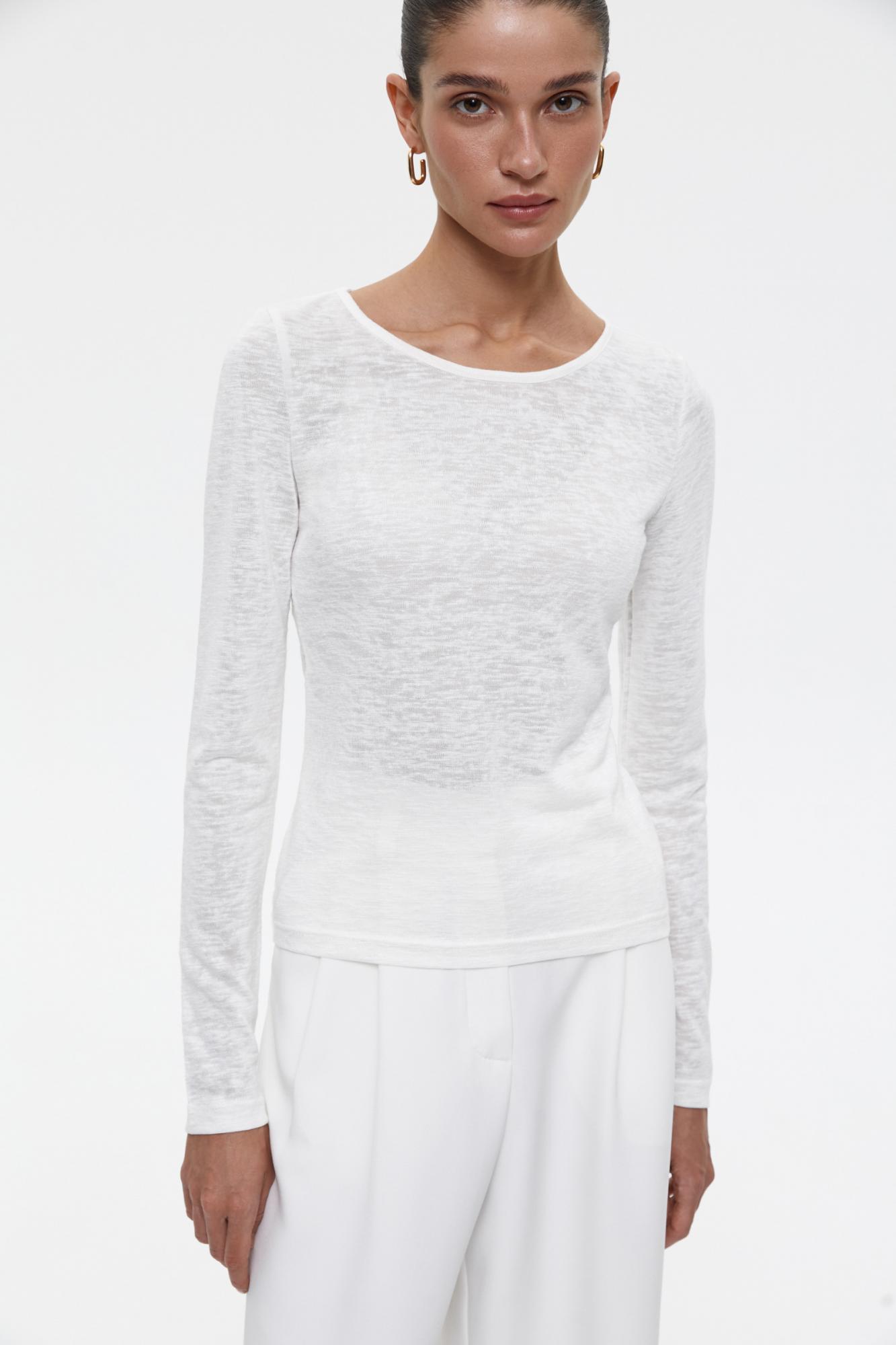 Лонгслив с длинным рукавом в облегающем силуэте из полупрозрачного трикотажа. Четкая плечевая линия обеспечивает правильную посадку. Для большего комфорта мы сделали аккуратный круглый вырез.