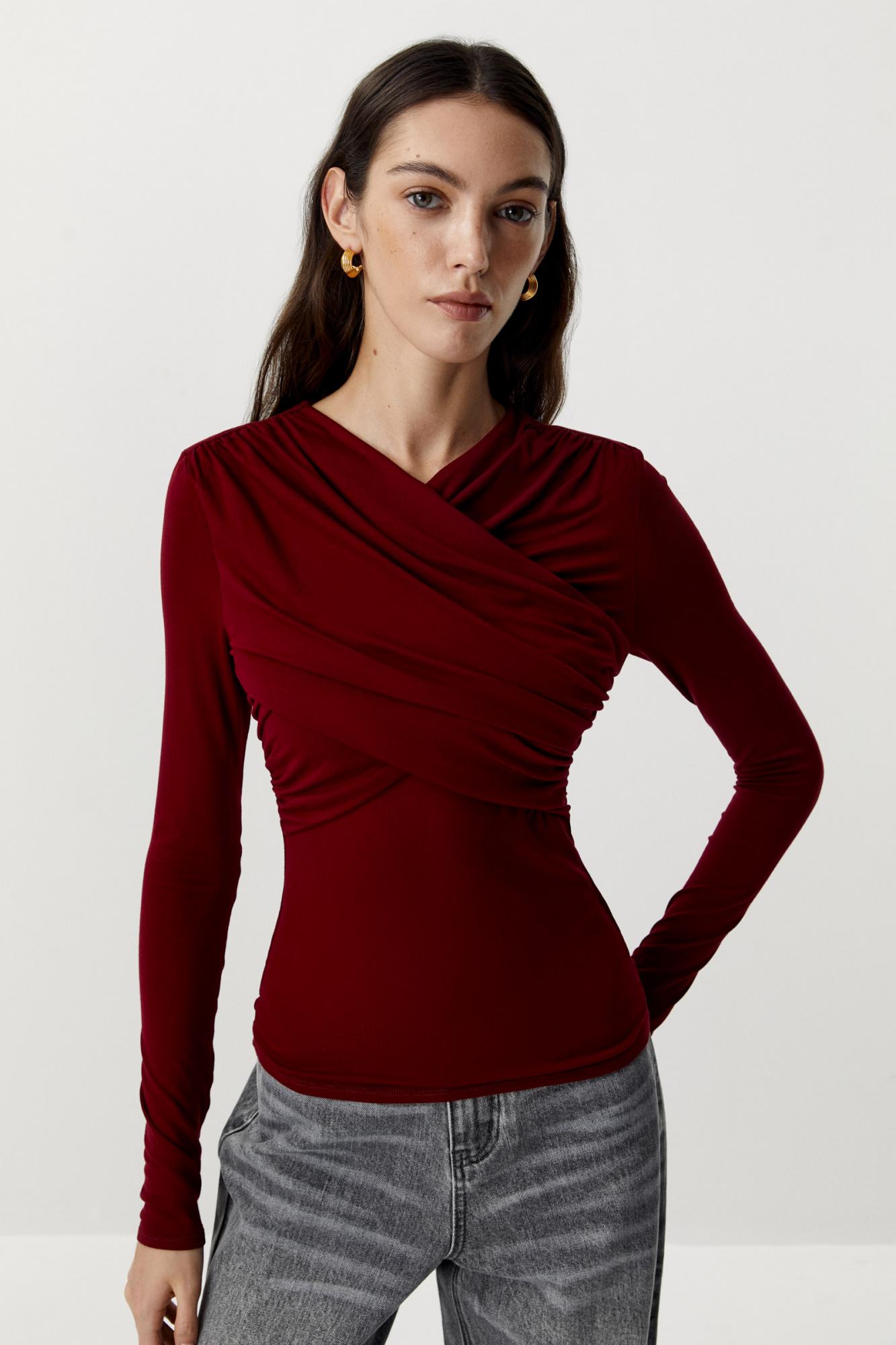 Облегающий лонгслив из трикотажа. Декоративные сборки по груди и боку изделия визуально уменьшают линию талии, формируя четкий силуэт песочные часы. Нежная вискоза приятна к телу, благодаря чему лонгслив очень комфортен в использовании.