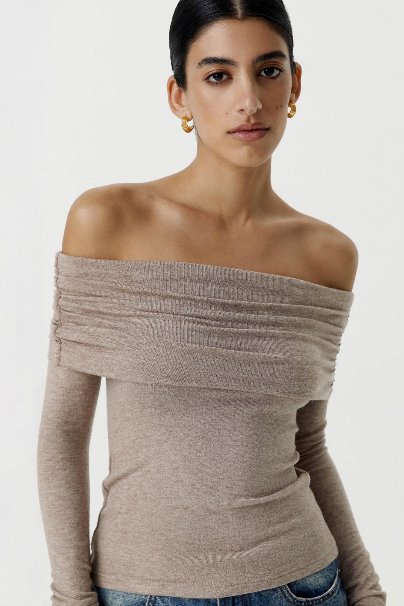 Лонгслив с драпировкой на плечах из мягкого трикотажа (светло-коричневый)