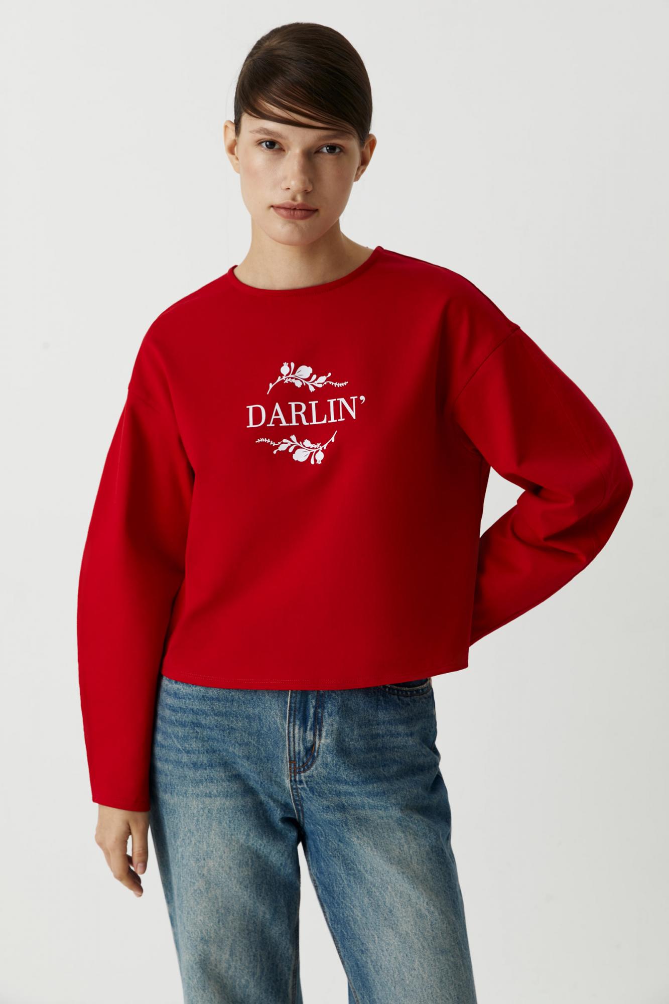 Укороченный хлопковый лонгслив с длинным свободным рукавом. За комфорт в изделии отвечает расслабленный крой и спущенная линия плеча. Особенная деталь — надпись Darlin (пер. с англ. — дорогая).