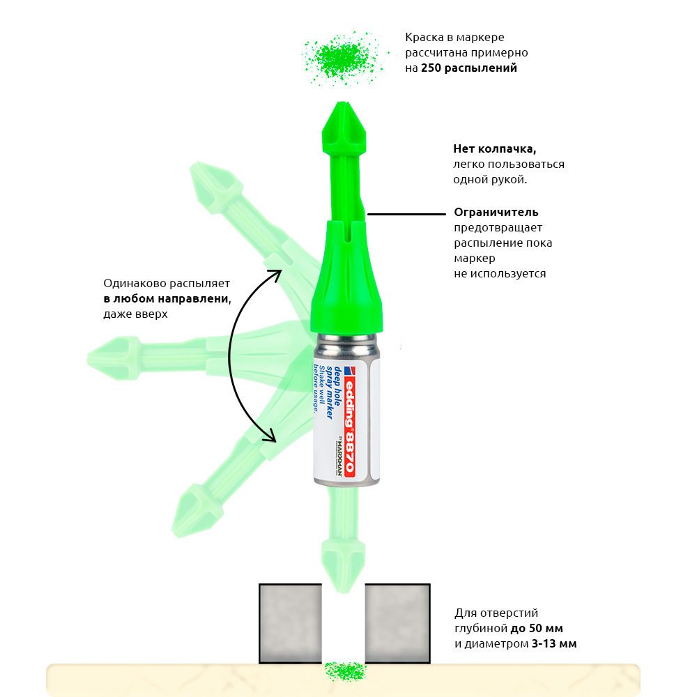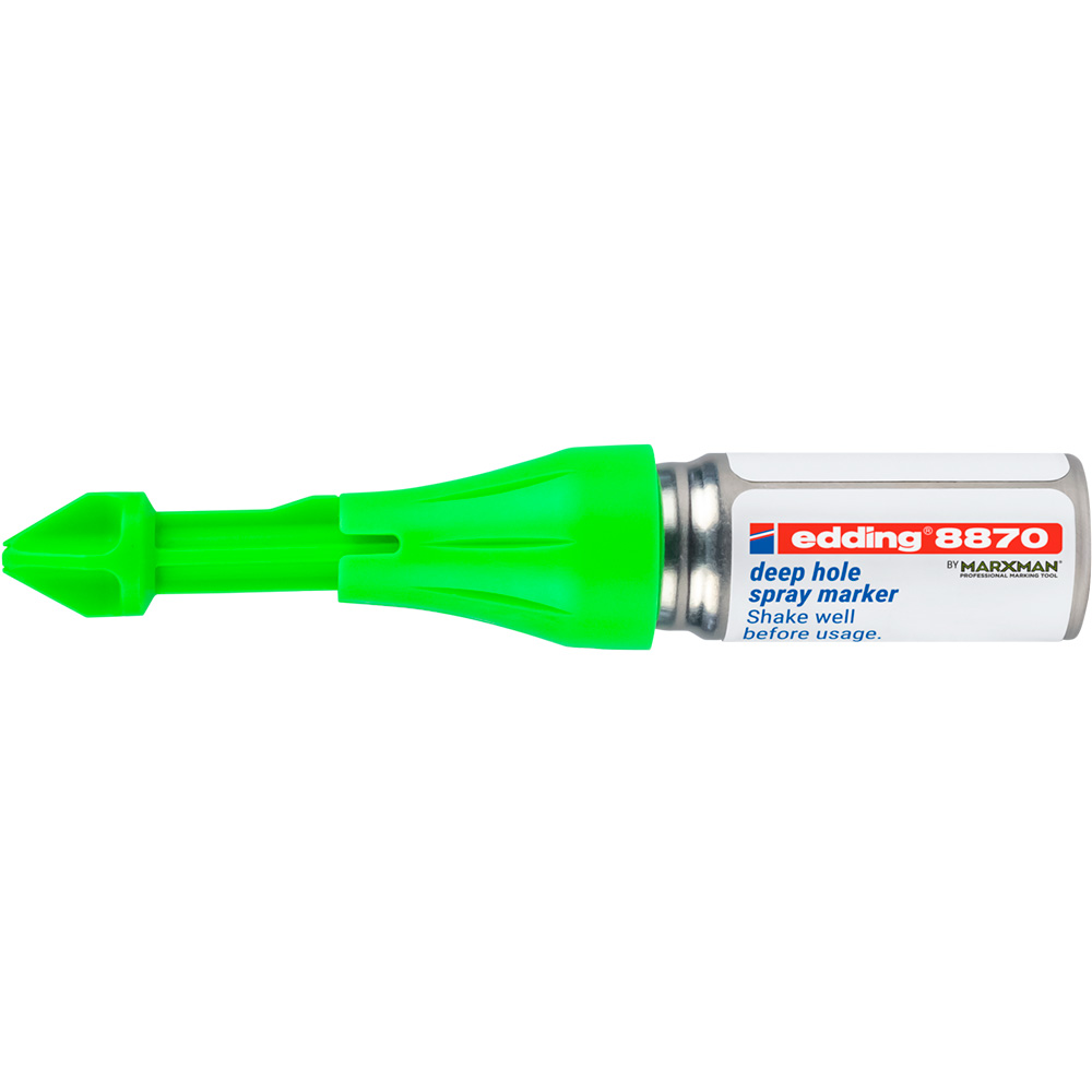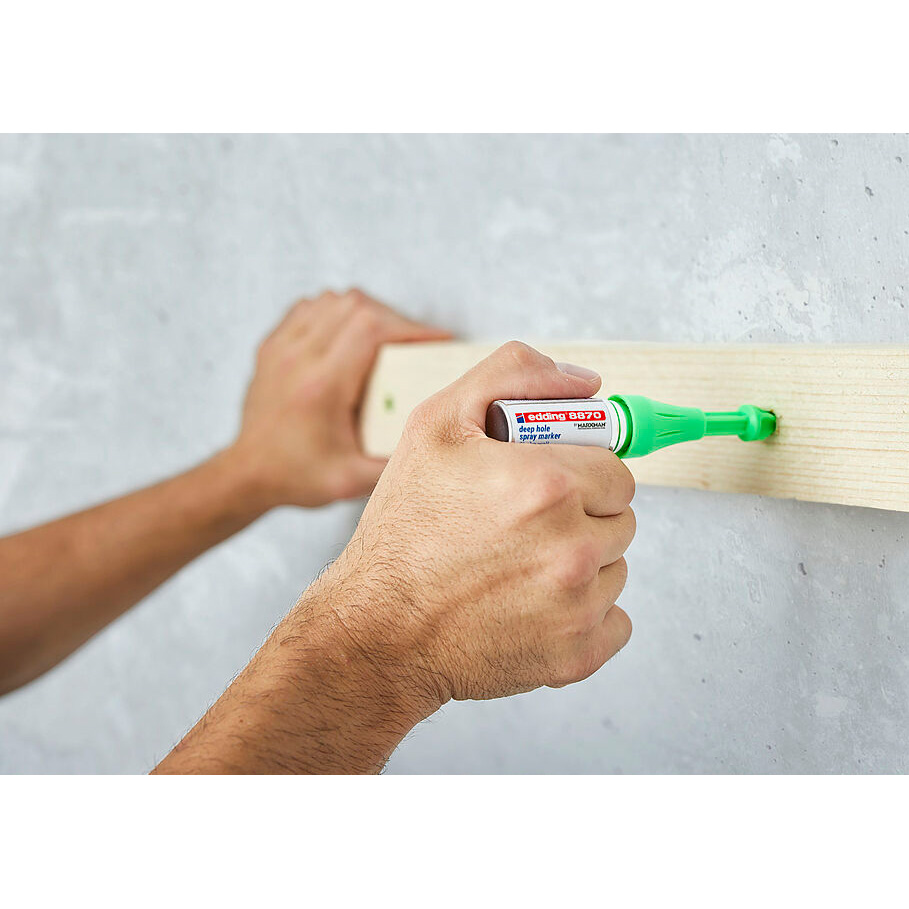 Меловой маркер-спрей edding 8870 – это специальное решение для разметки особо глубоких отверстий в труднодоступных местах. Маркер с запатентованным насосным механизмом для нанесения временной маркировки в труднодоступных местах, практически на всех материалах. Сопло индивидуальной формы мелового спрея позволяет наносить маркировку через просверленные отверстия глубиной до 50 мм и диаметром 3 - 13 мм. Можно использовать под любым углом и на любой высоте, даже над головой. Неперманентный мел легко стирается с закрытых поверхностей для быстрой корректировки.