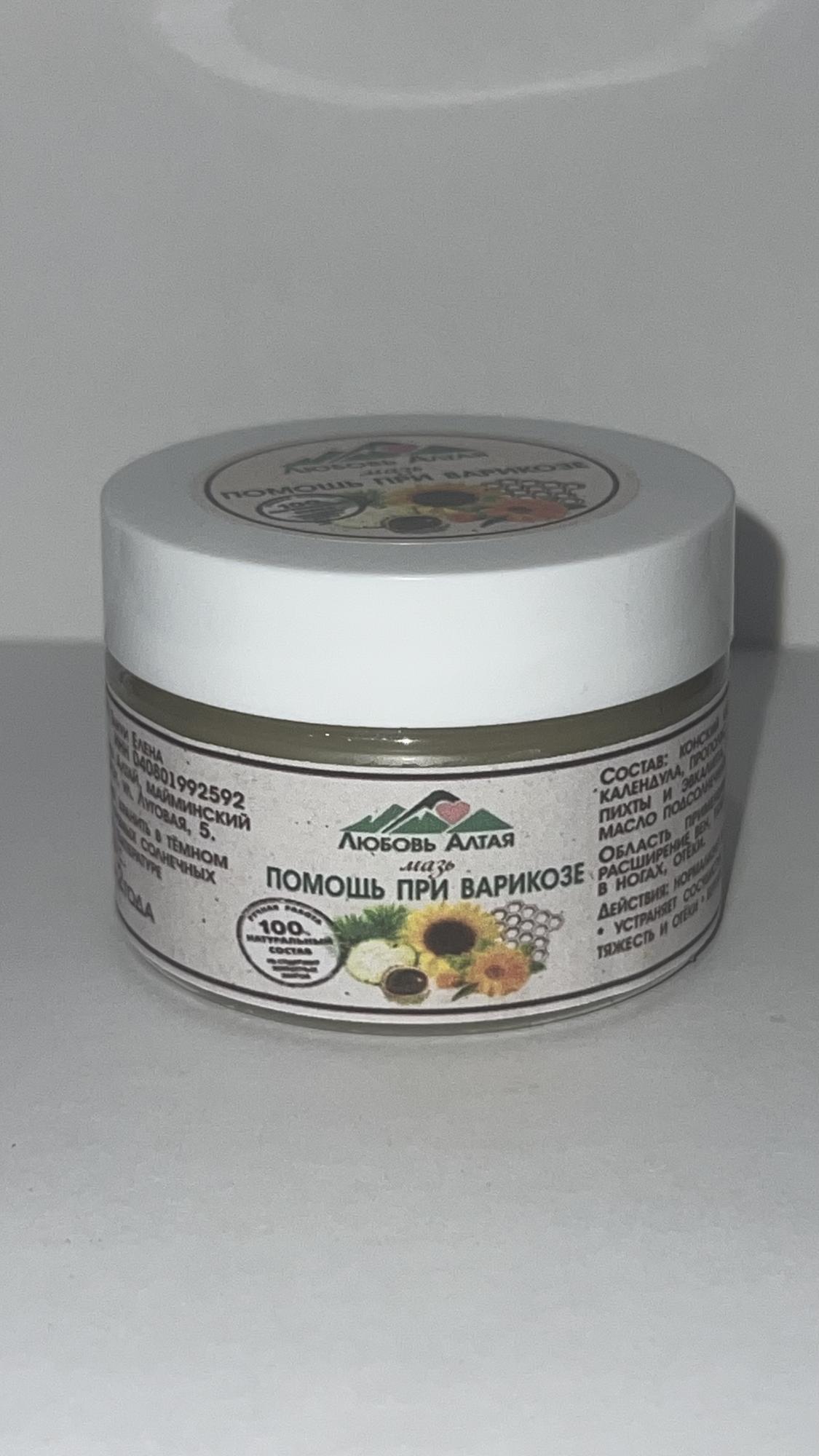 Мазь «Помощь при варикозе» — натуральное средство для облегчения симптомов варикозного расширения вен с конским каштаном и прополисом.натуральная негормональная мазь для облегчения симптомов варикоза. Сочетает силу целебных растений, прополиса и эфирных масел. Уменьшает отёчность и тяжесть в ногах, снимает усталость и болевые ощущения, улучшает состояние вен. Подходит для регулярного применения.