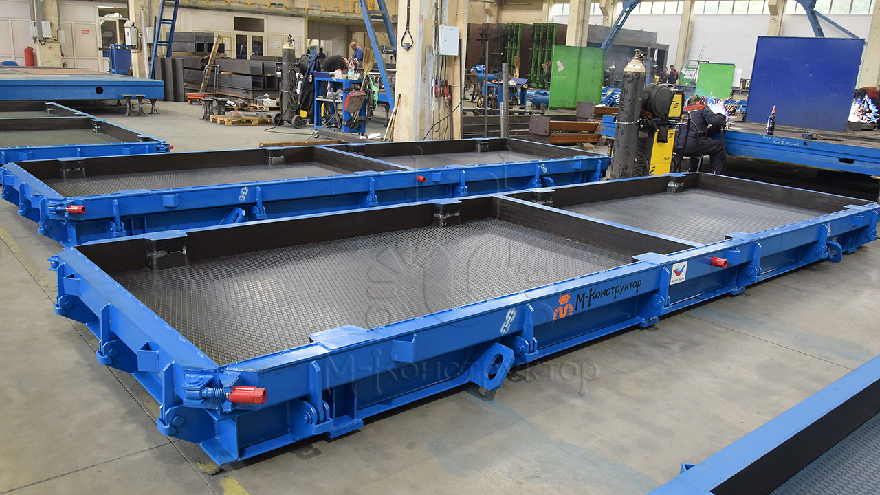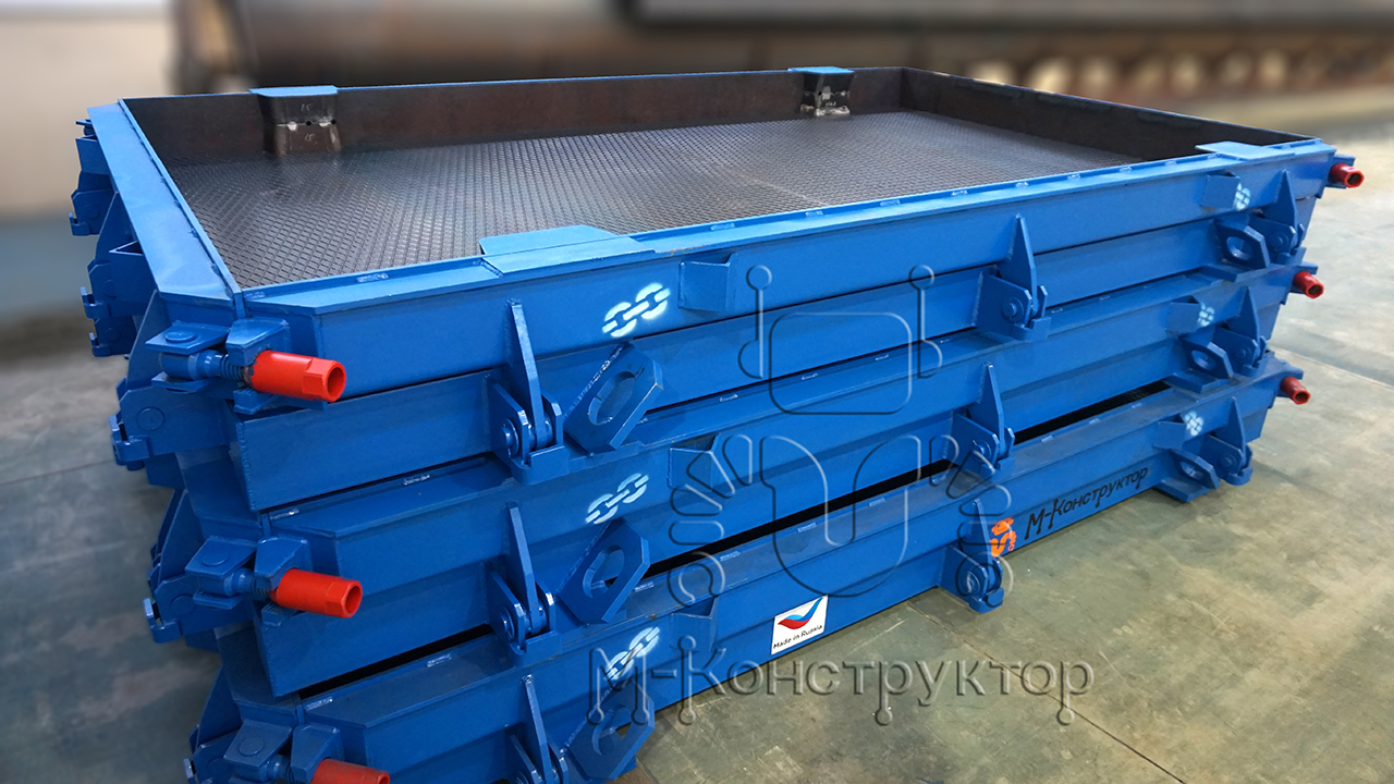 «М-Конструктор» изготавливает формы для производства данных плит как с гладкой, так и с рифлёной поверхностью. Типоисполнение: формы с четырьмя открывающимися бортами. Матричные формы с открывающимися торцевыми бортами и петлеобразователями, продольными бортами, неоткидные.