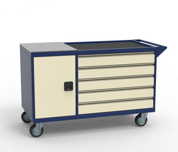 Габаритные размеры в сборе с ручкой - 800х1305х600 мм - Внутренние размеры выдвижных ящиков - 91х694х565 мм - Сварной каркас из профильной трубы 40х20х1,5 мм, все остальные конструктивные материалы изготовлены из х/к листа толщиной 1,5 мм. - Верстак перемещается на большегрузных колёсах Ø125 мм, нагрузка на колесо до 160 кг, два с тормозом - В левой части верстака расположена тумба с дверью и полкой - Верхняя поверхность оснащена накладкой из металлического листа толщиной 6мм - Правая часть тележки с 5-ю выдвижными ящиками - Верхняя часть в виде лотка с резиновым МБС ковриком, толщиной 3 мм.