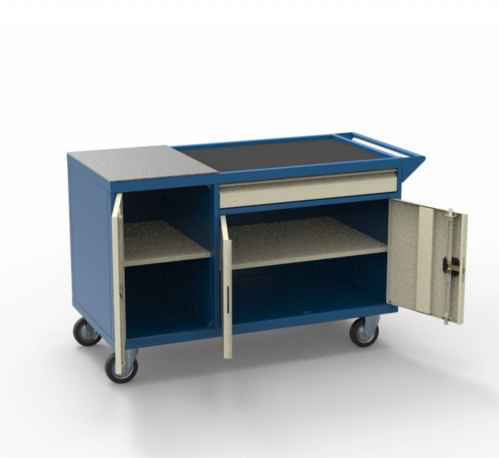 Верстак выполнен на сварном каркасе из профильной трубы 40х20х1,5 мм, все остальные конструктивные материалы изготовлены из х/к листа толщиной 1мм. Верстак установлен на большегрузные колёса Ø125 мм, нагрузка на колесо до 160 кг, два с тормозом - в левой части верстака расположена тумба с дверью и полкой - верхняя поверхность оснащена накладкой из металлического листа толщиной 6 мм - правая часть тележки с дверцами и полкой, и 1 выдвижным ящиком - верхняя часть в виде лотка с резиновым ковриком, толщиной 3мм.