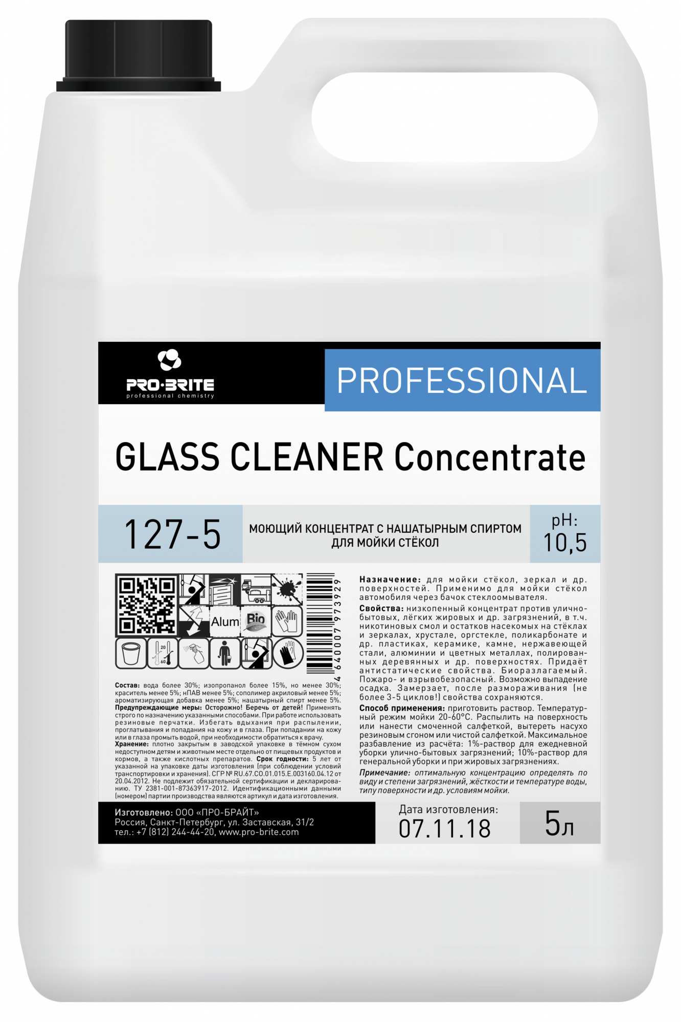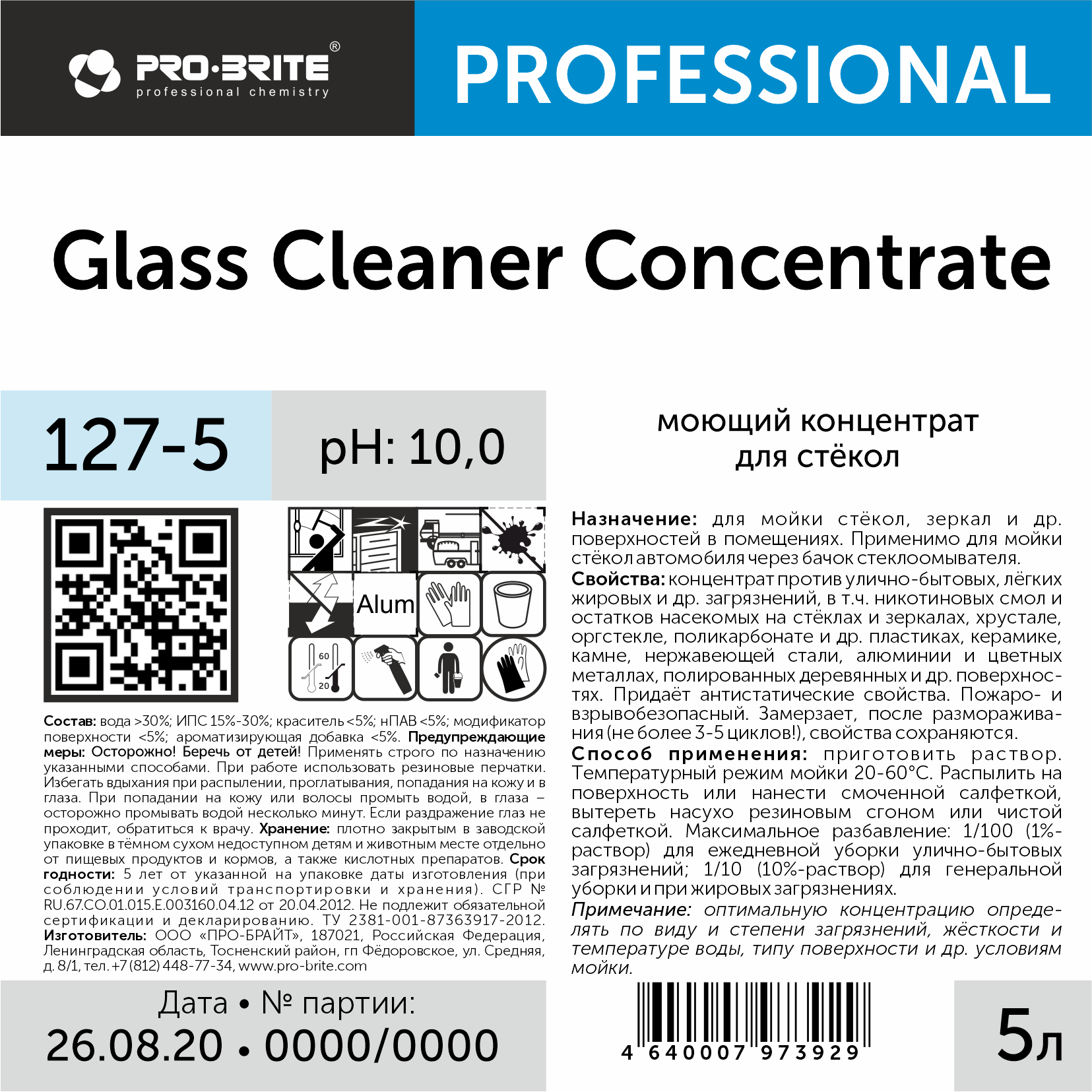 Жидкий щелочной низкопенный концентрат, прозрачный тёмно-зелёного цвета с ароматом арбуза, против улично-бытовых, лёгких жировых и др. загрязнений, в т.ч. никотиновых смол и остатков насекомых на стёклах и зеркалах, хрустале, оргстекле, поликарбонате и др. пластиках, керамике, камне, нержавеющей стали, алюминии и цветных металлах, полированных деревянных и др. поверхностях. Придаёт антистатические свойства. Пожаро- и взрывобезопасный. Замерзает, после размораживания (не более 3-5 циклов!), свойства сохраняются.