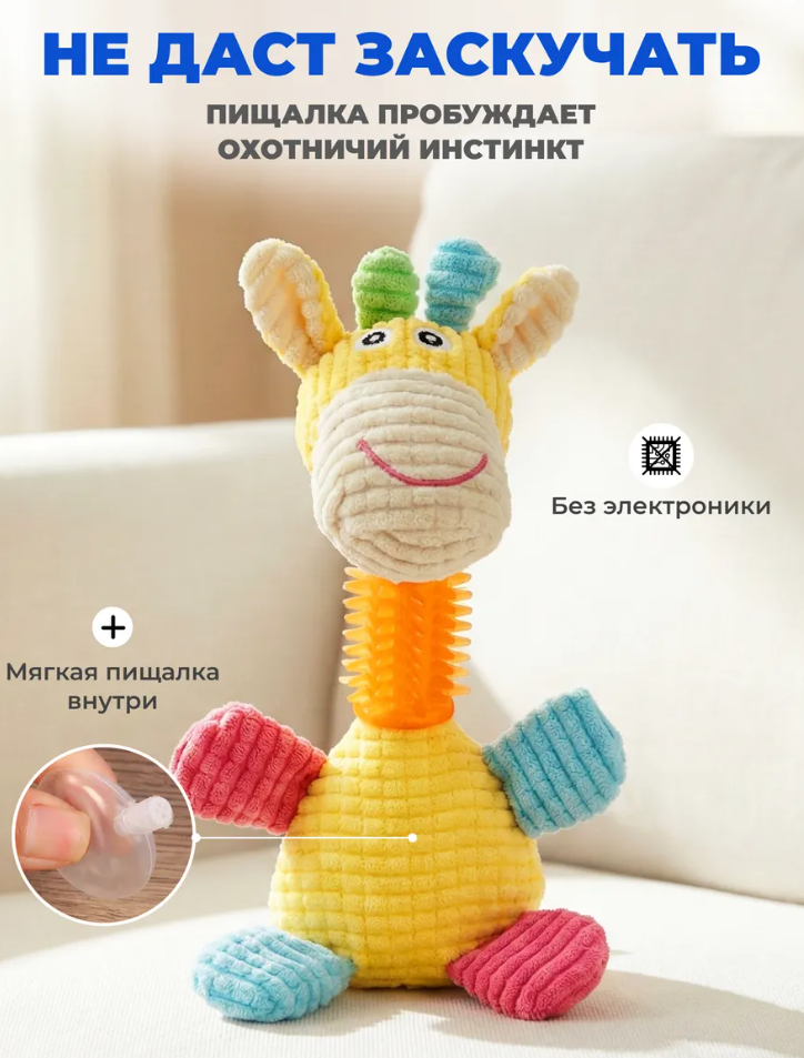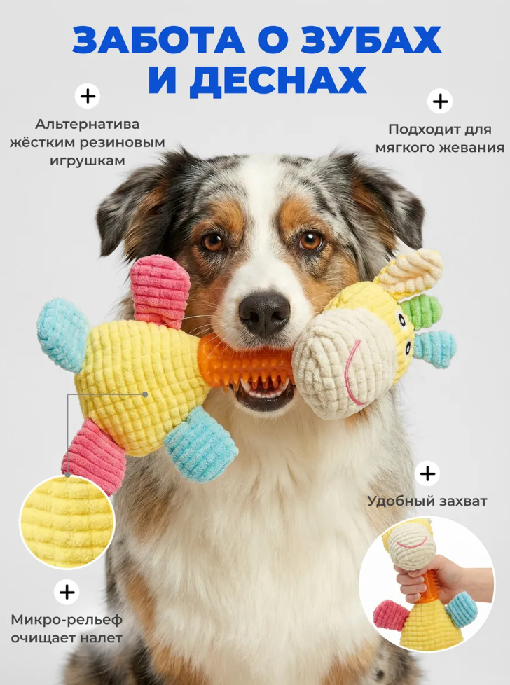 Мягкая игрушка для собак с пищалкой создана для активных игр, жевания и эмоциональной разрядки питомца. Формат грызака помогает переключить внимание с мебели и вещей, снижает тревожность и занимает собаку дома или на прогулке.