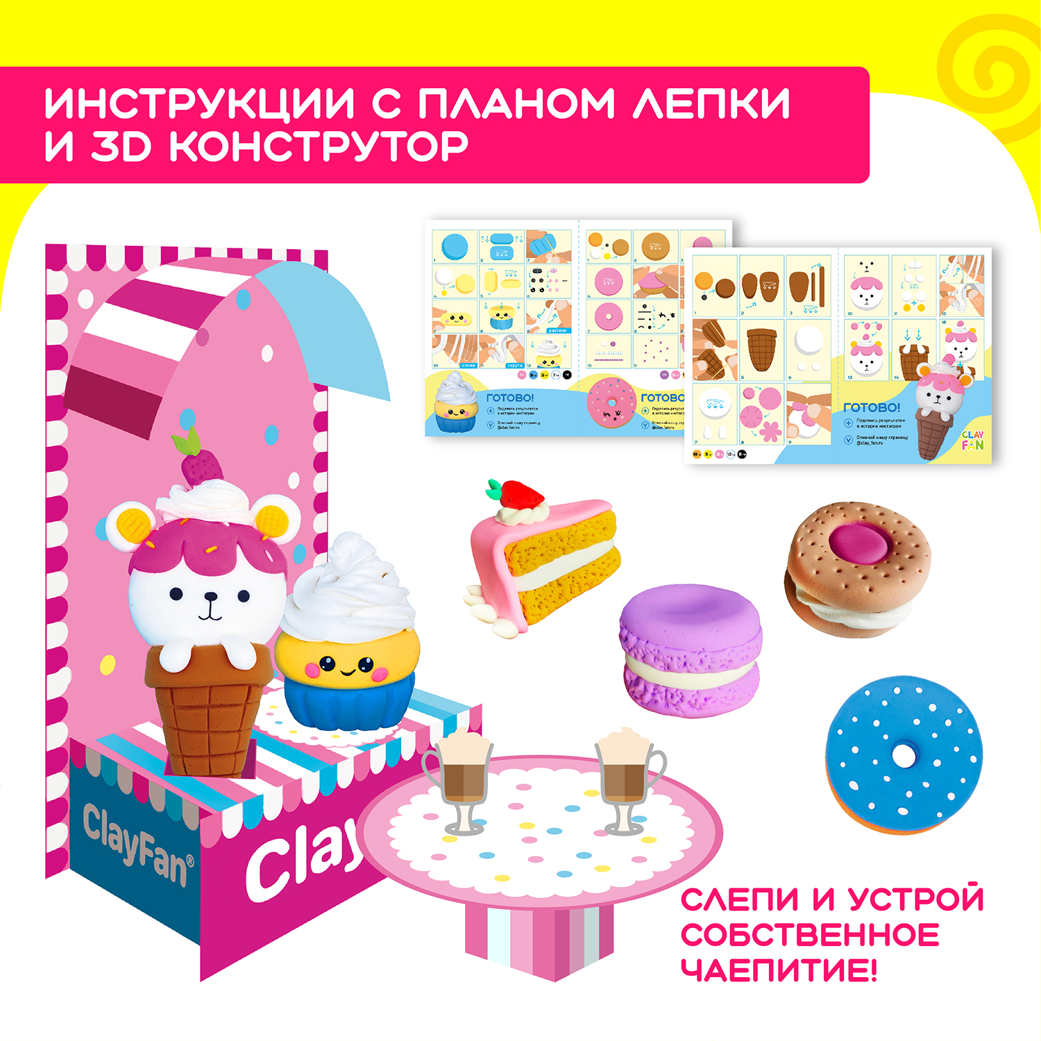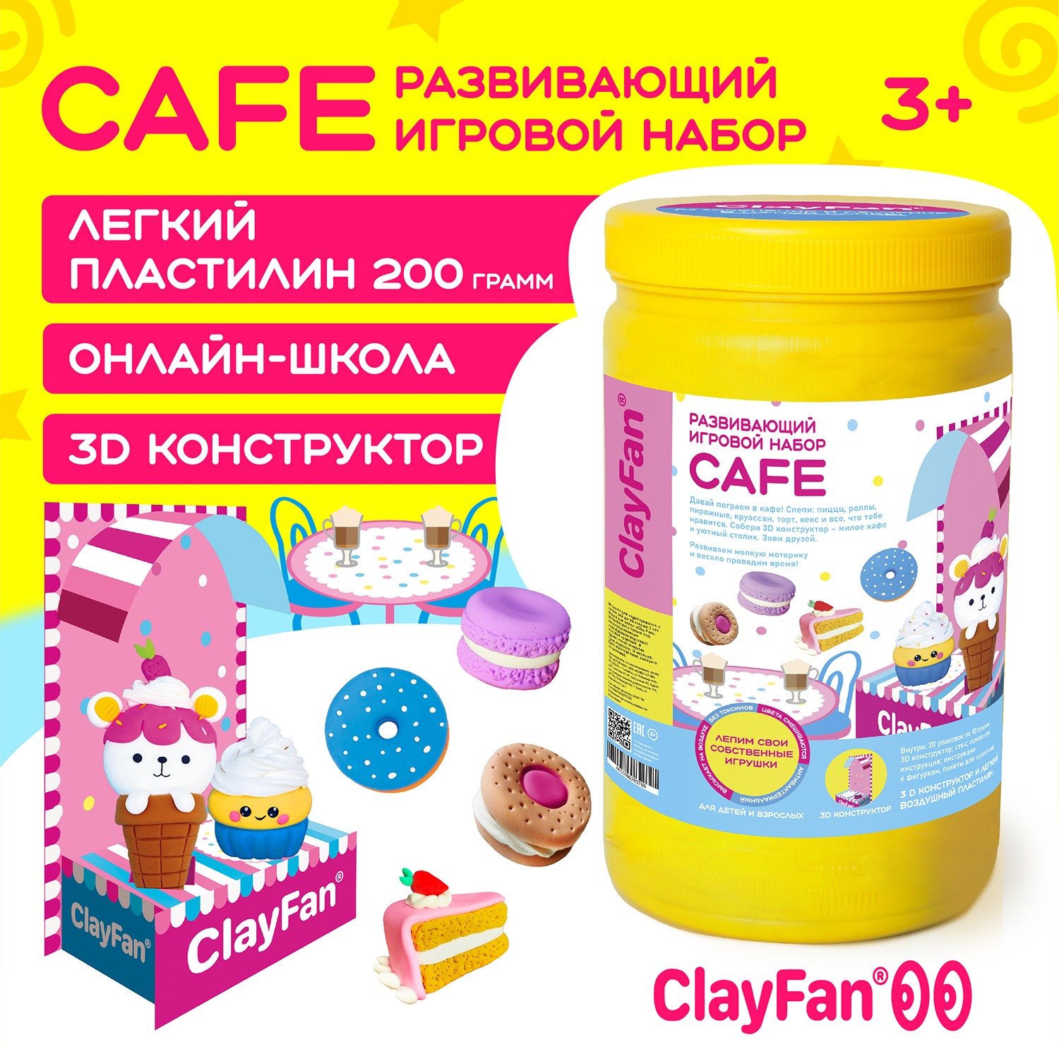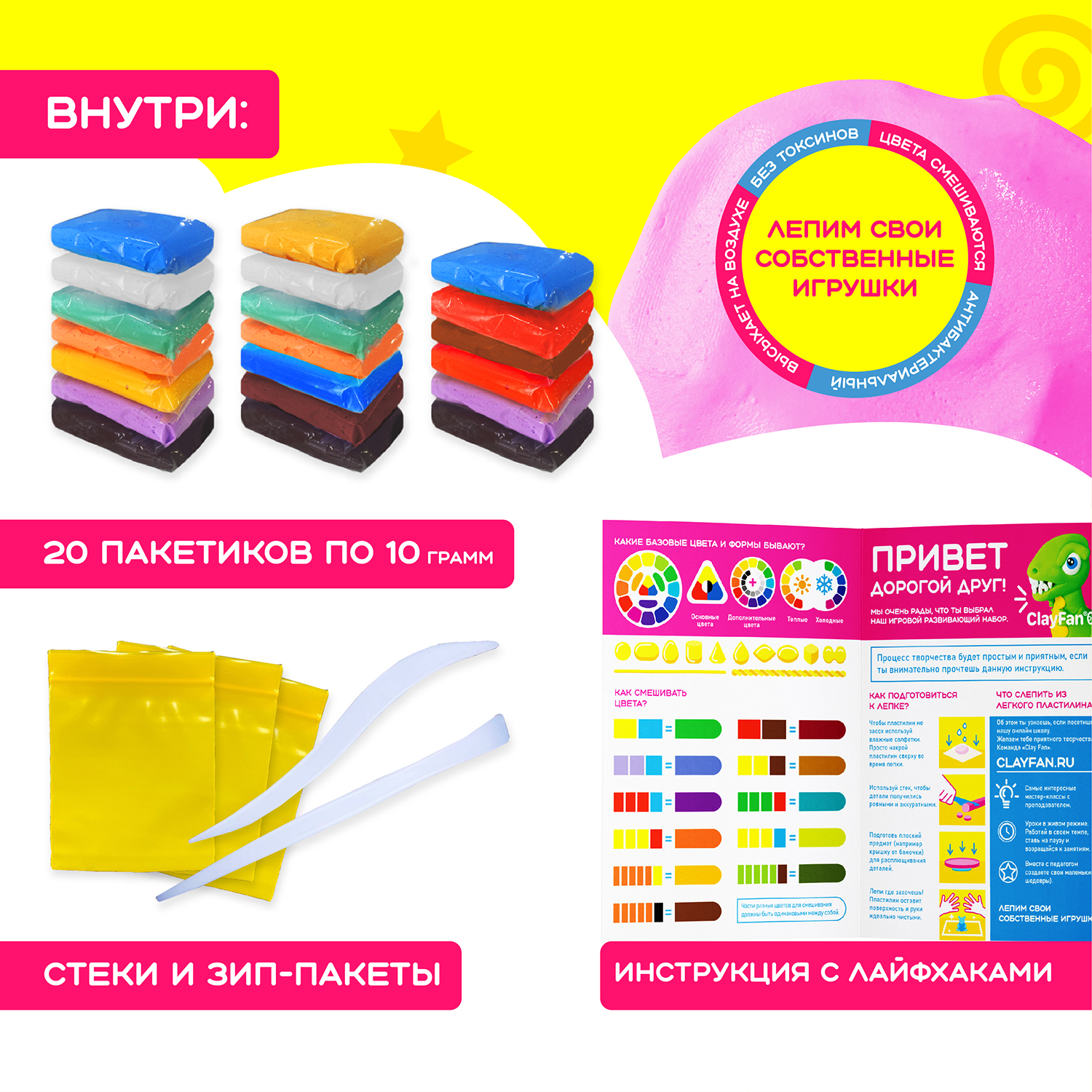 В упаковке 20 пакетов пластилина по 10 граммов (200 граммов), 3D картонная конструкция, 2 стека, основная инструкция, инструкция к фигурам, 10 зип-пакетов для хранения, пластиковая банка.