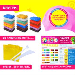 В упаковке 20 пакетов пластилина по 10 граммов (200 граммов), 3D картонный конструктор, основная инструкция, инструкции к персонажам, 2 стека, 10 зип- пакетов для хранения, пластиковая банка.