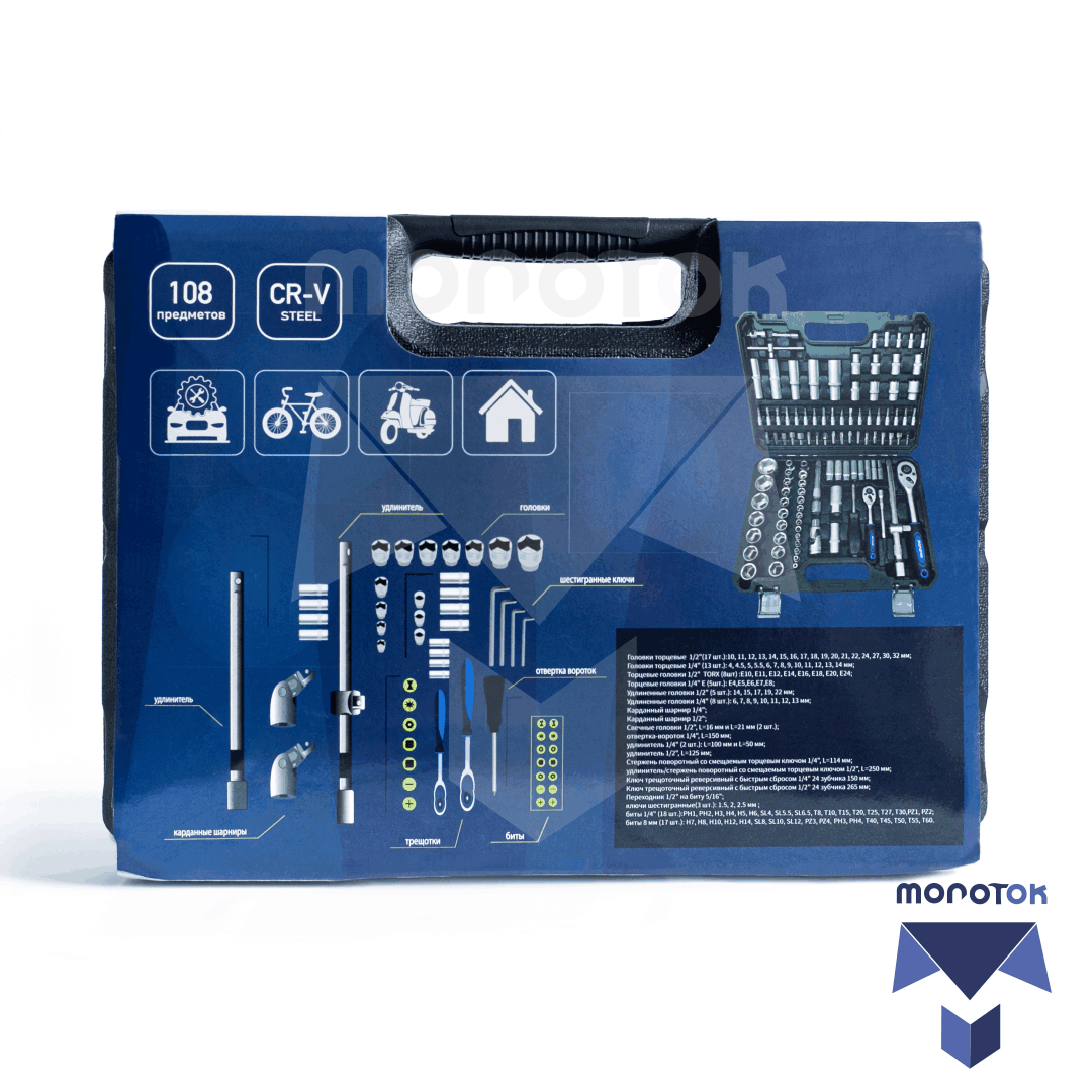 Переходник 2шт ⅜"на ¼";¼" на 6,35; Карданный шарнир ½", ⅜", ¼"; Отвертка-вороток ¼"; Вороток с плавающим квадратом; Удлинитель ½" 2 шт, ¼" 2шт, ⅜ 1шт; Удлинитель/стержень поворотный со смещаемым торцевым ключом ½", ¼";