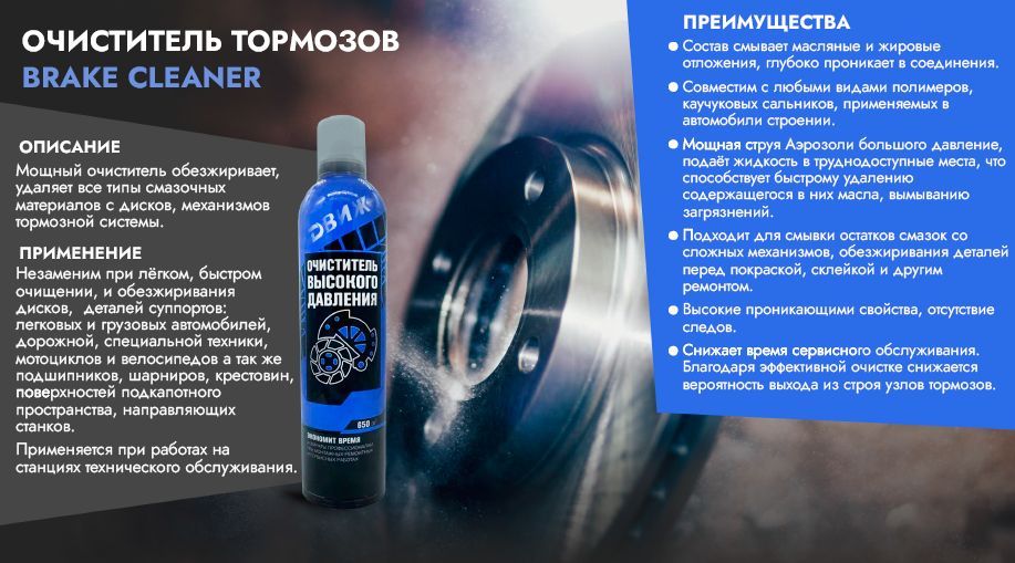 ДВИЖ мощный очиститель тормозов, аэрозольный баллон 650 мл.Обезжиривает, удаляет все виды смазочных материалов с дисков, механизмов тормозной системы.