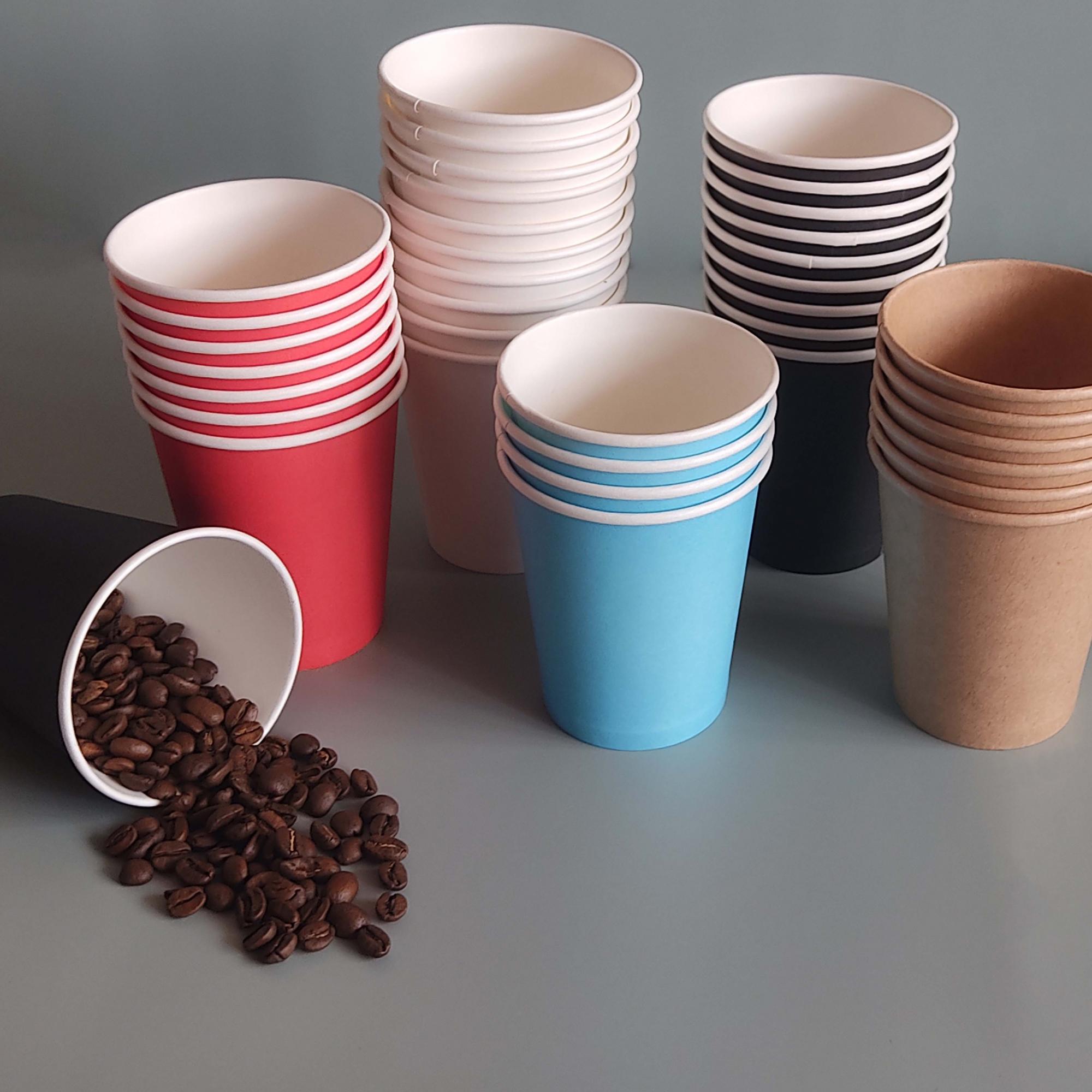 Бумажные стаканы объемом 150 мл, 250 мл, 350 мл, 450 мл. Бумажный стакан изготовлен из целлюлозного картона плотностью от 205 г/м2. Произведен из немелованного или мелованного картона. Для защиты стакана от взаимодействия с водой слои картона обрабатываются полимером.