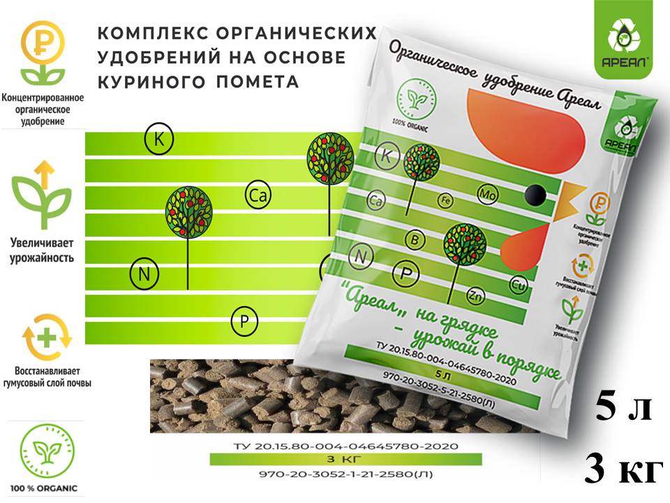 Компания "Ареал" производит удобрения, увеличивающие урожайность и его качества. В его составе содержатся все необходимые для плодоношения и качественного созревания макро- и микроэлементы в нужном соотношении. Достоинства препарата: экологическая чистота и безопасность, содержит всё необходимое для улучшения качества почв. Органические удобрения "Ареал" содержит все элементы, требуемые для растения в быстроусвояемой̆ форме, в отличии от минеральных удобрений, что позволяет получить экологически чистый̆ урожай.