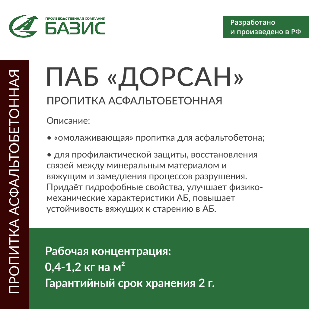 ПАБ «Дорсан» – комбинированный дорожный пропиточный материал на микробитумополимерной основе с минеральным наполнителем. Пропитка предназначена для профилактической защиты покрытия с одновременным улучшением свойств, содержащихся в нем битумных вяжущих, оказывает омолаживающий эффект на органическое вяжущее. Она способствует восстановлению связей между минеральным материалом и вяжущим и замедлению процессов разрушения. Проникая внутрь асфальтобетона, пропитка ПАБ «Дорсан» становится прочной мембраной, которая возвращает дорожному полотну упругость и устойчивость. Бензин, кислота, щелочи, технические масла остаются на поверхности и больше не причиняют вреда асфальту.