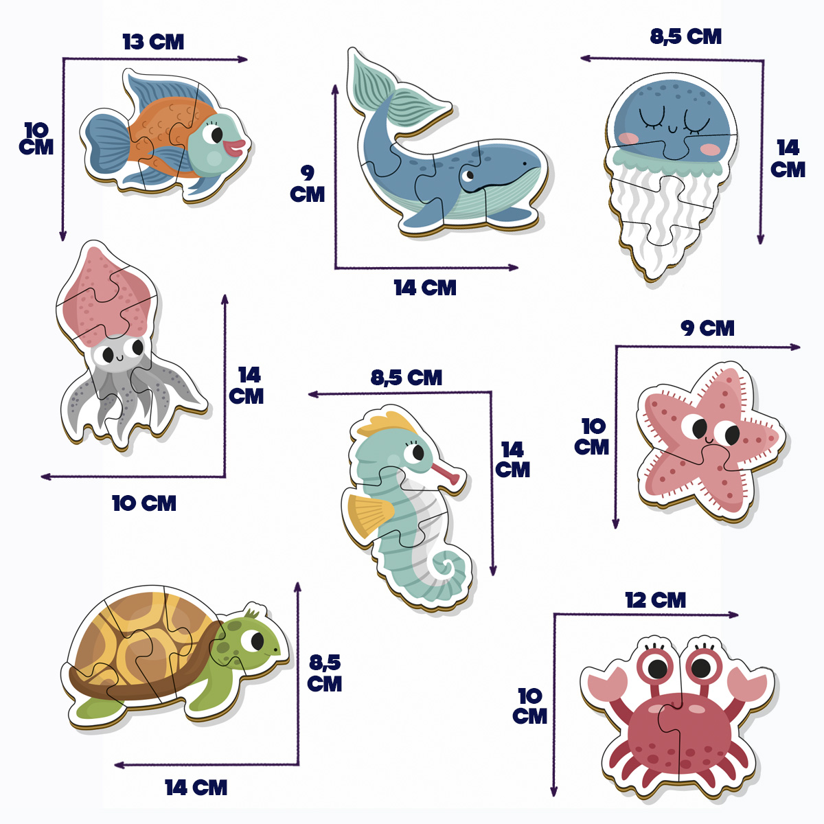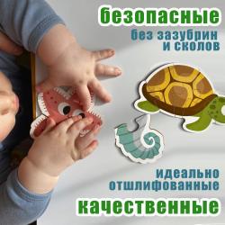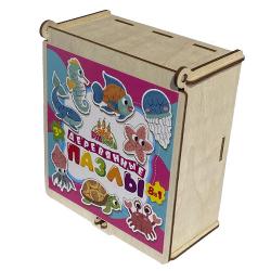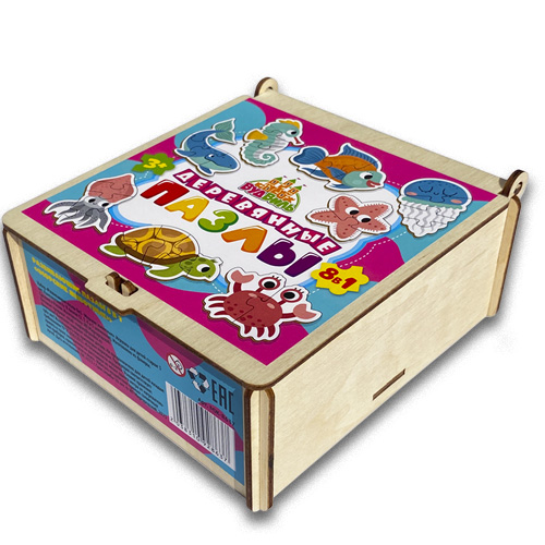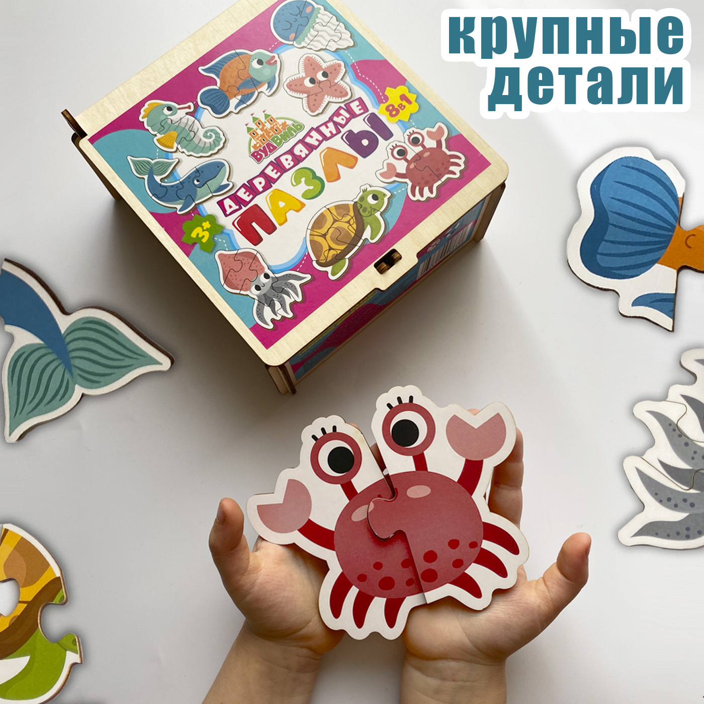 Набор пазлов из дерева для малышей "Морские жители". 8 штук деревянные пазлы в красивом и практичном деревянном сундучке. 2,3,4,5,6 крупных элементов.