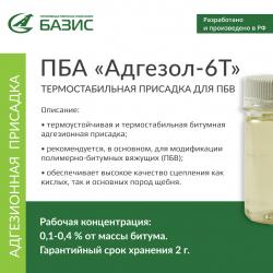 ПБА «Адгезол-6Т» – термоустойчивая и термостабильная присадка битумная адгезионная присадка на основе сложных эфиров фосфорной кислоты. Значительно улучшает эксплуатационные характеристики битума (ПБВ) (пластичность, хрупкость и т.д.) и асфальтобетонных смесей (устойчивость к колееобразованию и др.), оказывает положительное влияние при производстве ПБВ.