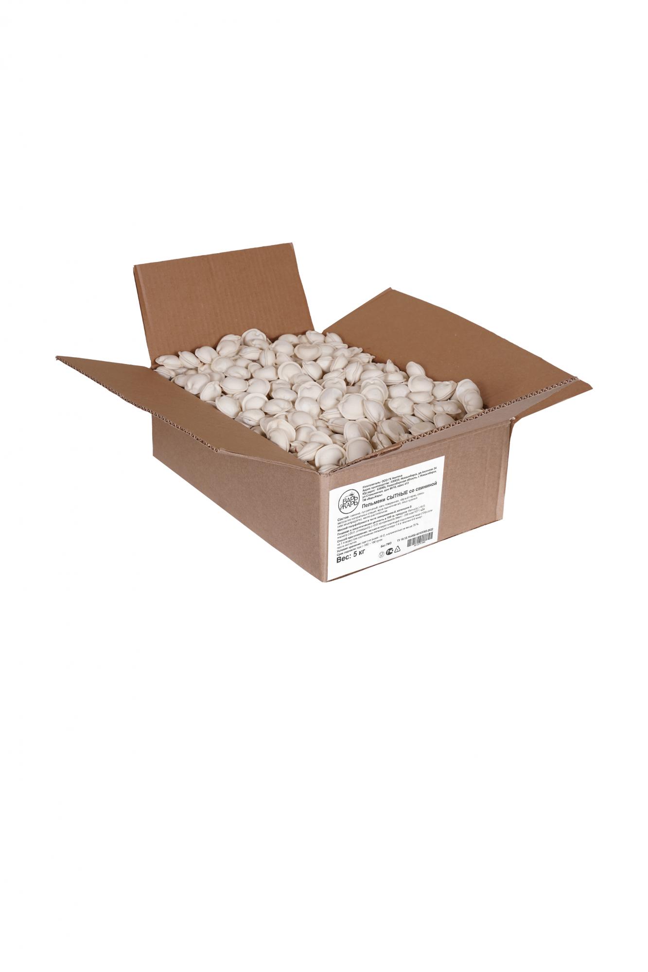 Пельмени Сытные (свинина). ТМ ВарьЖарь. Категория Б. Тонкое тесто, много начинки. Без добавления ГМО и улучшителей вкуса. Продукция прошла испытания и имеет протоколы соответствия. Гофрокороб 5 кг.