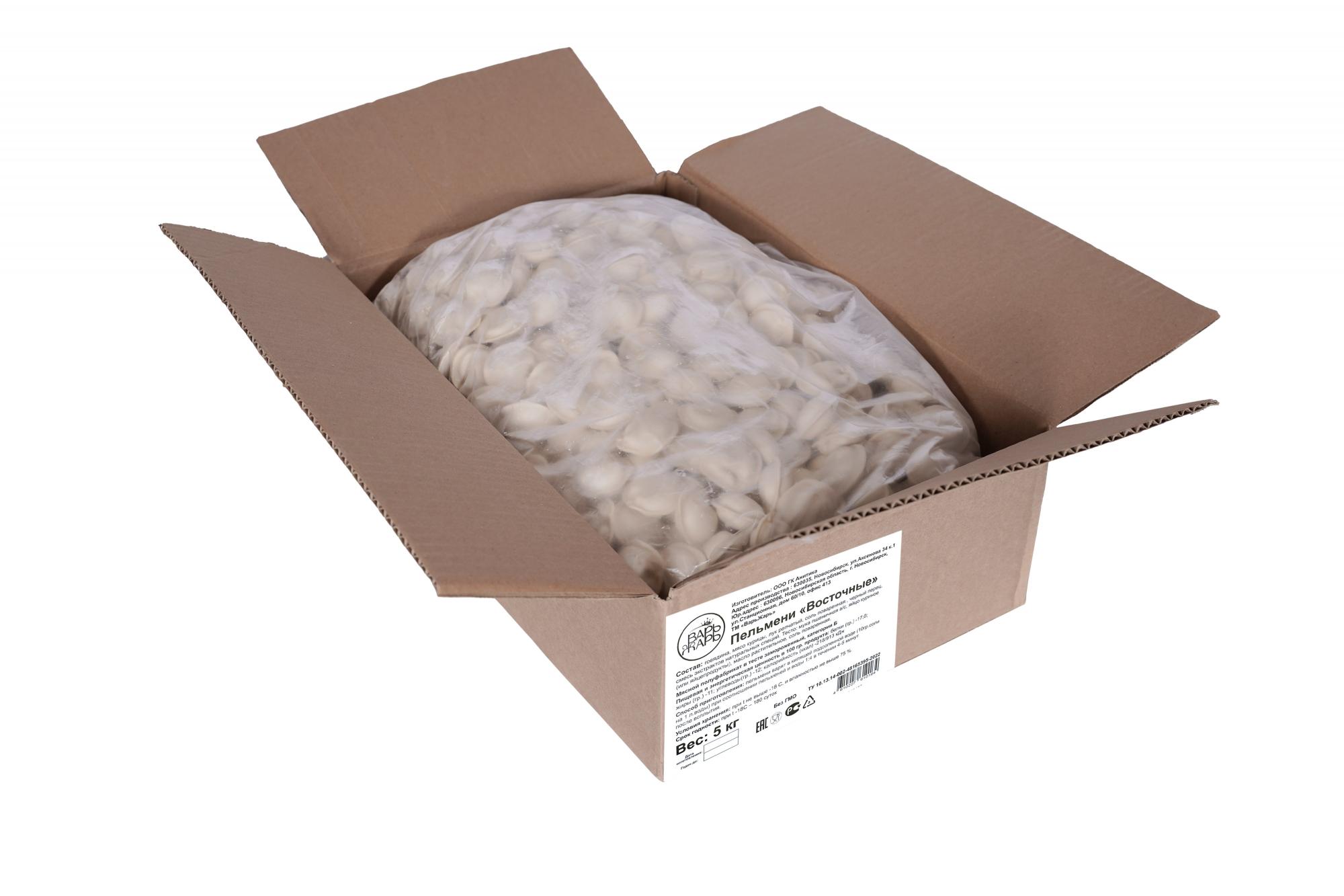 Пельмени Восточные (говядина, курица). ТМ ВарьЖарь. Категория Б. Тонкое тесто, много начинки. Без добавления ГМО и улучшителей вкуса. Продукция прошла испытания и имеет протоколы соответствия. Гофрокороб 5 кг.