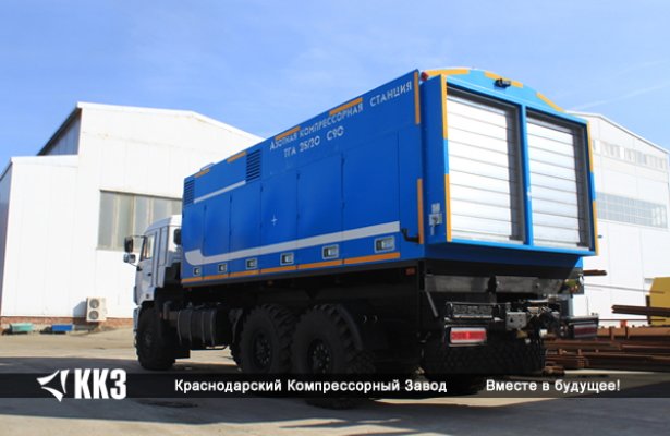 Азотная мембранная компрессорная станция СДА-25/20 на шасси грузового автомобиля для работы в нефтегазовой отрасли. Давление - 20 кгс/см². Производительность - 25 Нм³/мин. Чистота азота - до 99 %. Длина - 10000 см. Ширина - 2500 см. Высота - 3600 см. Вес - 25000 кг.