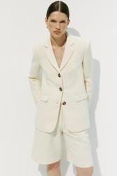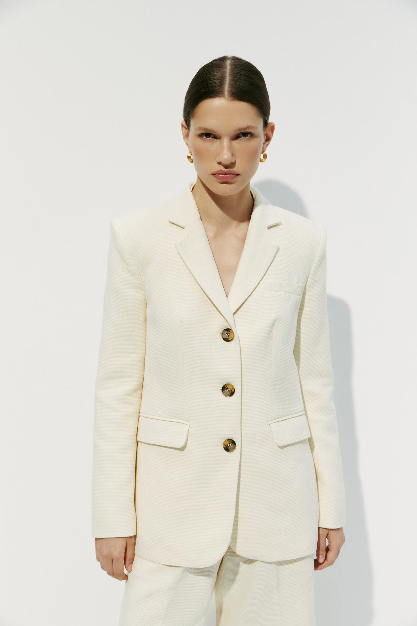 Однобортный приталенный пиджак из фактурной ткани. Женственный силуэт контрастирует с классическими лацканами. Плотная, фактурная ткань хорошо держит форму, для большей формоустойчивости пиджак точечно продублирован. Изделие имеет листочку и карманы, а также пуговицы на рукавах.