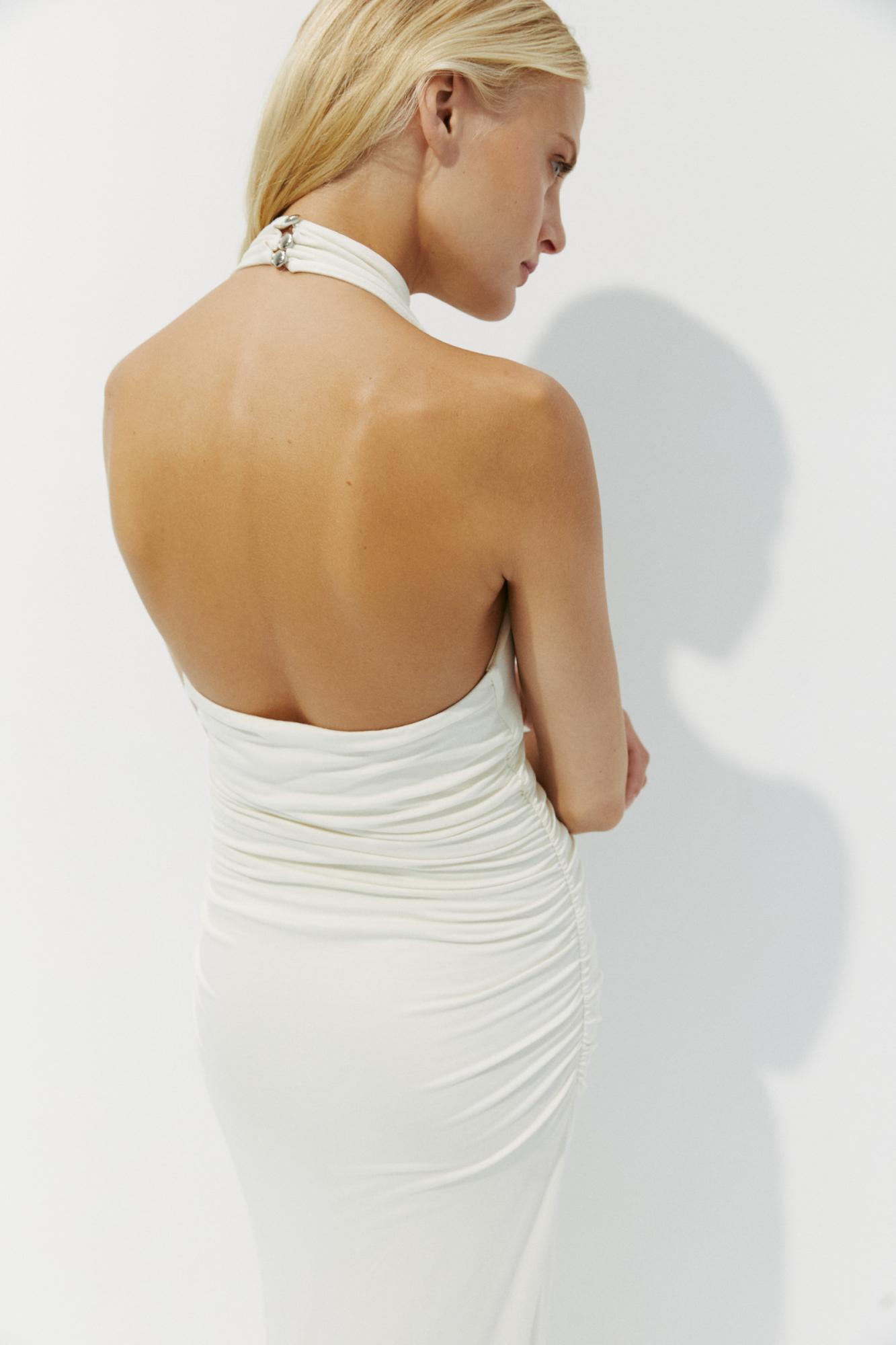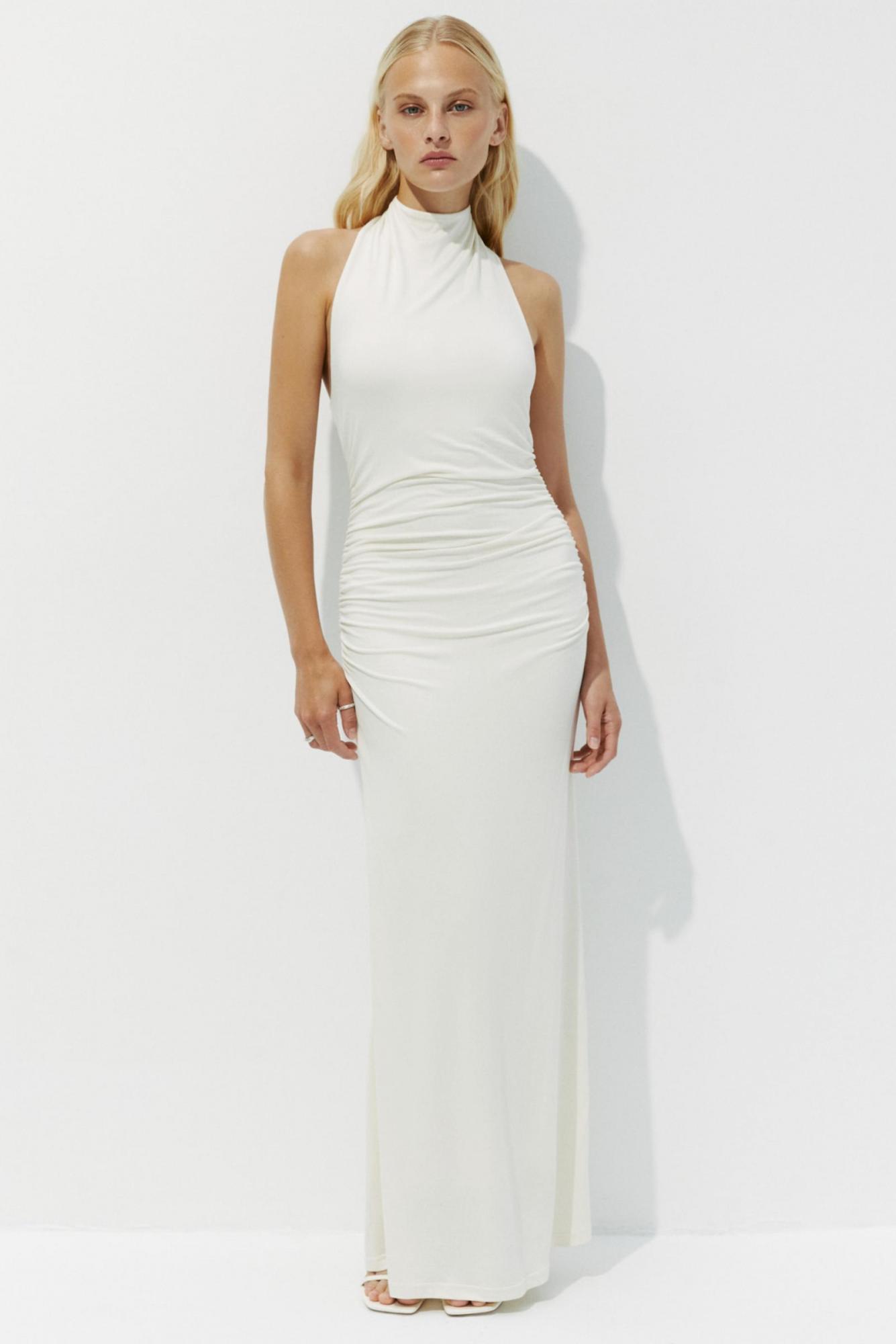 Облегающее макси платье с воротником халтер. Акцентом модели является воротник и эффектная открытая спина. Струящийся трикотаж деликатно прилегает к телу, обращая внимание на линию талии. За счет слегка расклешенного низа, модель очень удобна в носке. Большей выразительности платью добавляет драпировка по талии.