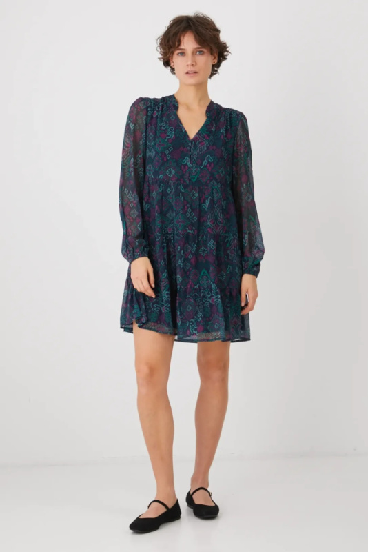 Платье длины мини. Свободного кроя, выполнено из ​​ткани с принтом. Острый вырез горловины. Короткая застежка на пуговицы. Модель с декоративной оборкой из прозрачного материала. Дополнительный слой материала в виде подкладки.