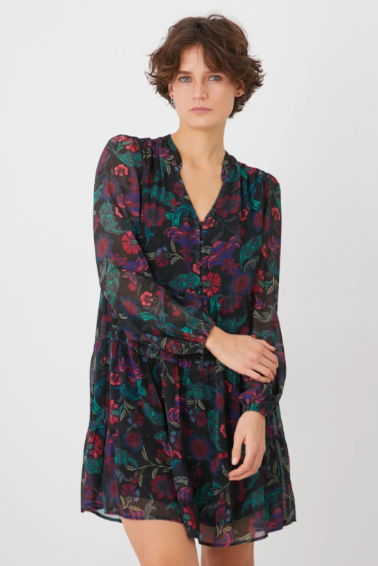 Платье длины мини. Свободного кроя, выполнено из ткани с принтом. Острый вырез горловины. Короткая застежка на пуговицы. Модель с декоративной оборкой из прозрачного материала. Дополнительный слой материала в виде подкладки.