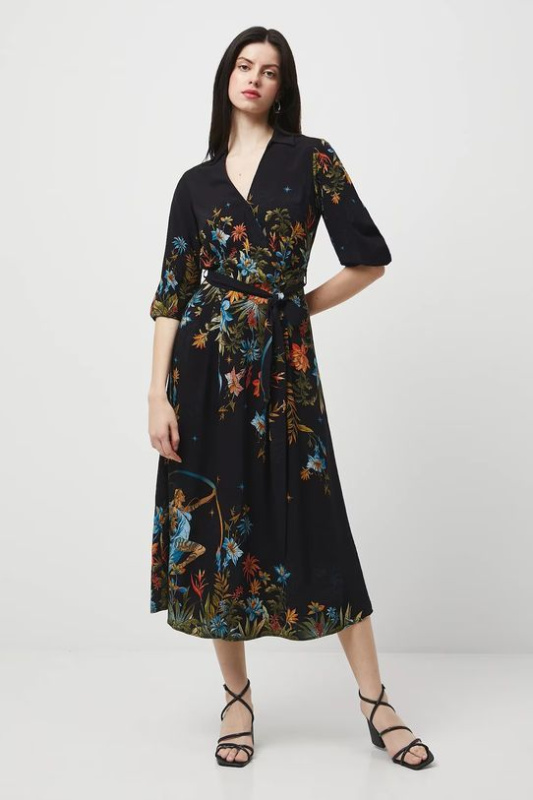 Платье длины миди. Расклешенный крой. Рукава три четверти на резинке. Вырез горловины застегивается на пуговицы. Отложной воротник. Цветочный принт.