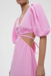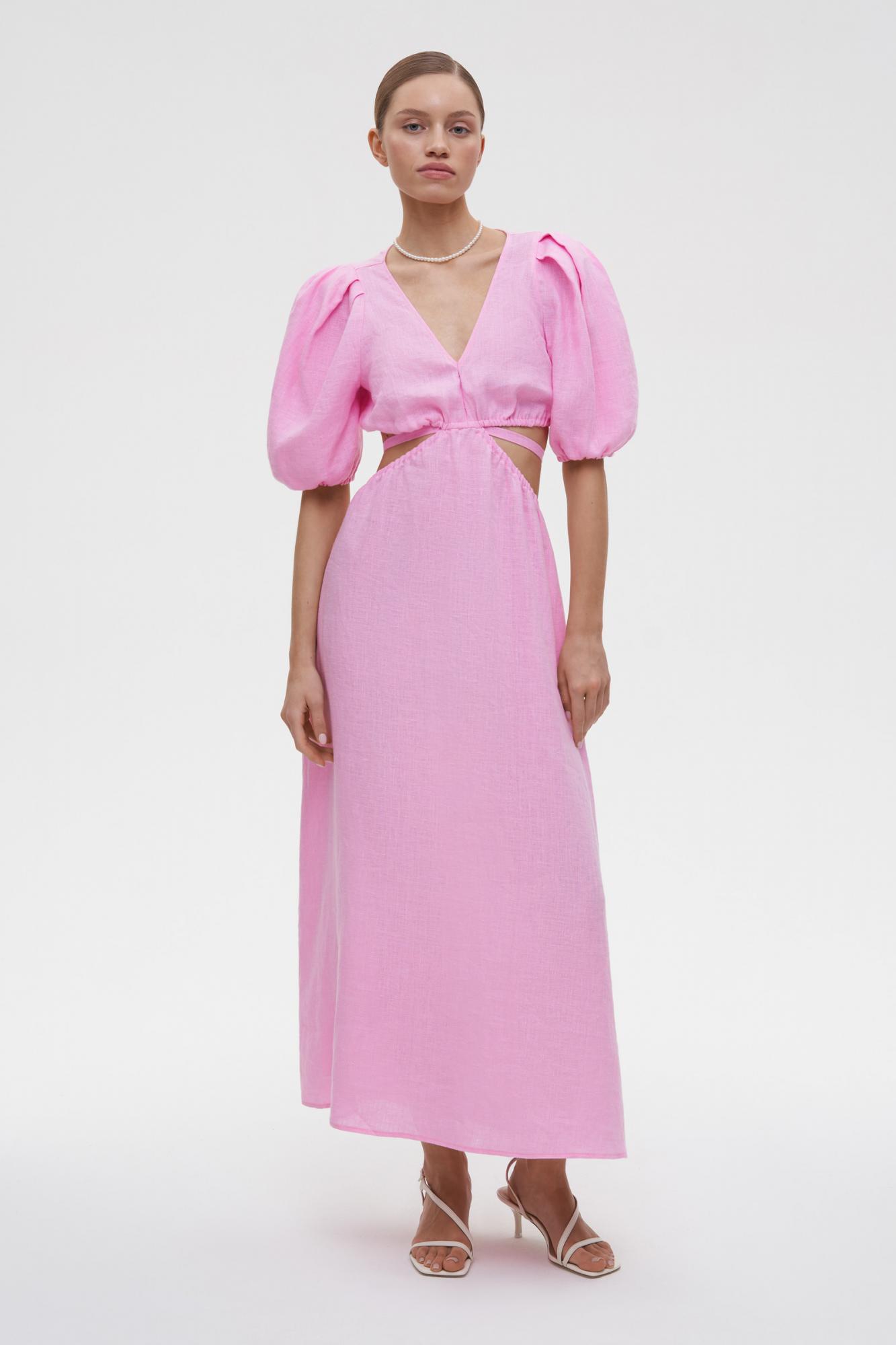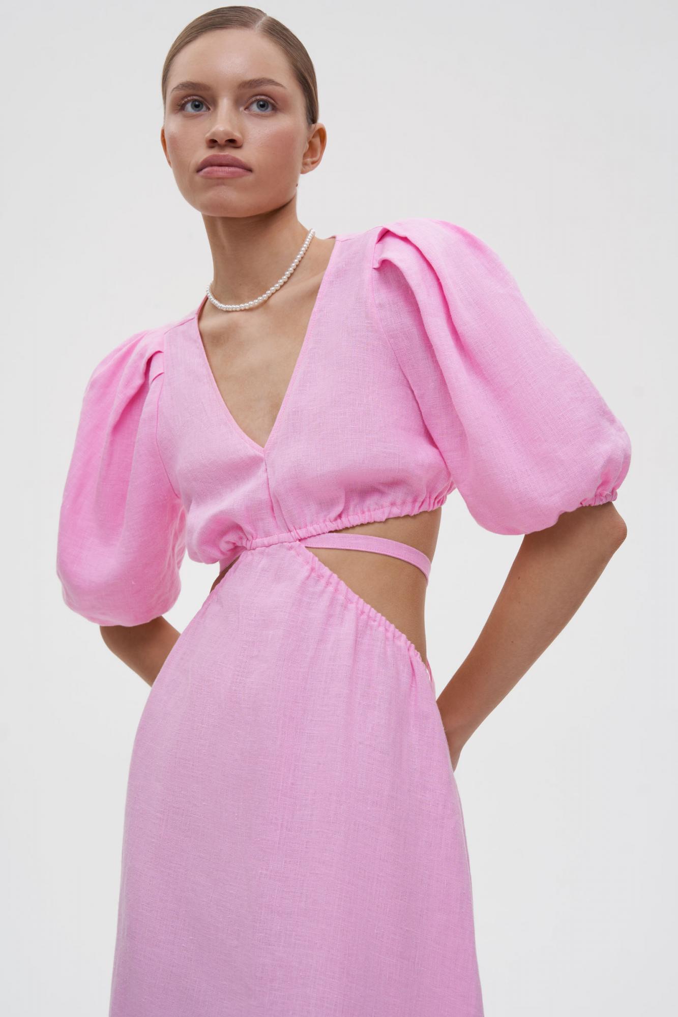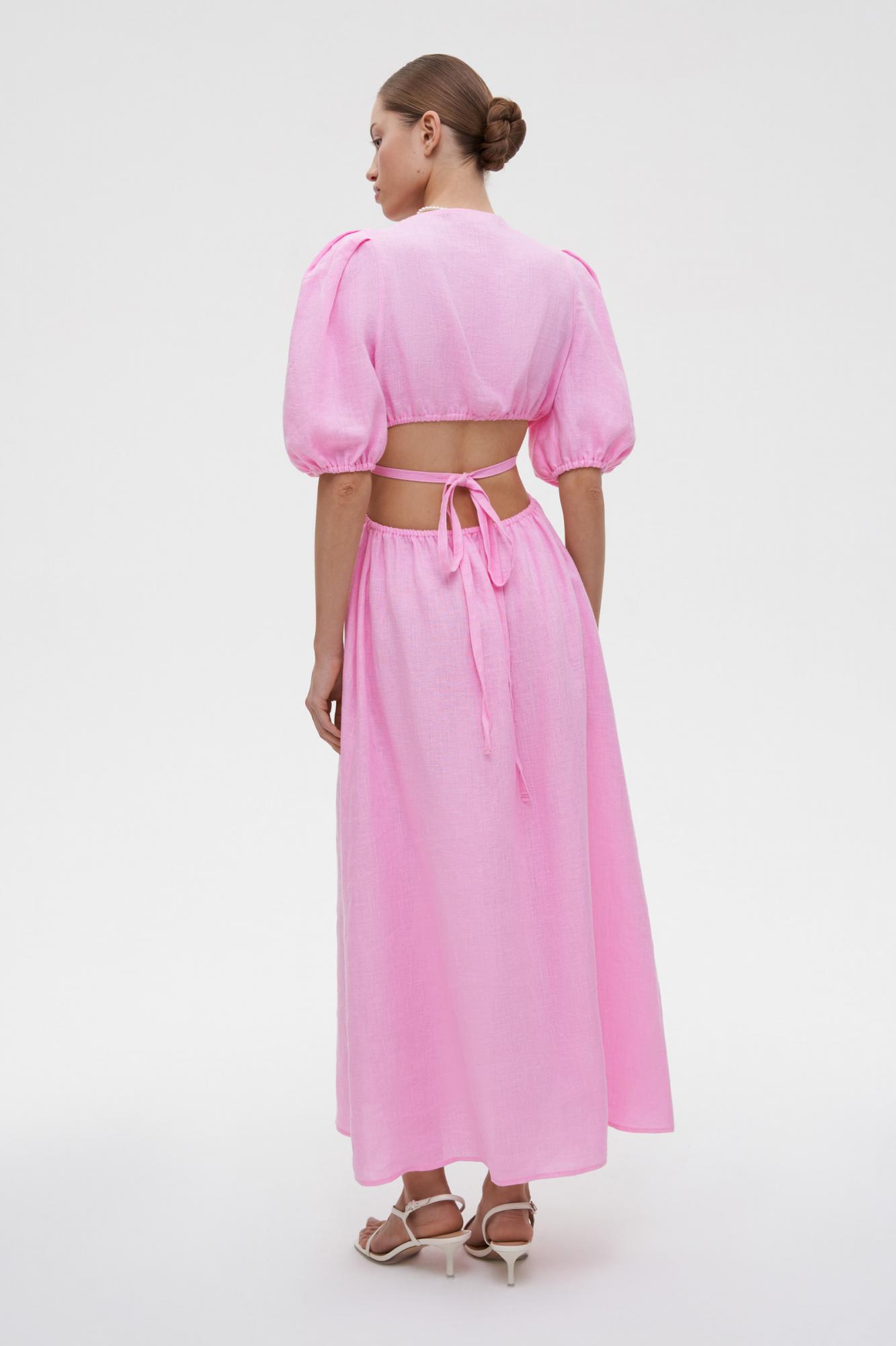 Платье миди изо льна с открытой спиной и V-образным вырезом — комфортный и красивый вариант для летнего гардероба. Приталенная модель, длина и рукава фонарики делают платье утонченным и элегантным. Благодаря тонким резинкам по талии можно комфортно зафиксировать лиф. Декоративные акцентные вырезы формируют женственный силуэт песочные часы. Изделие требует деликатного ухода, для сохранения привлекательного вида сушите в расправленном виде.