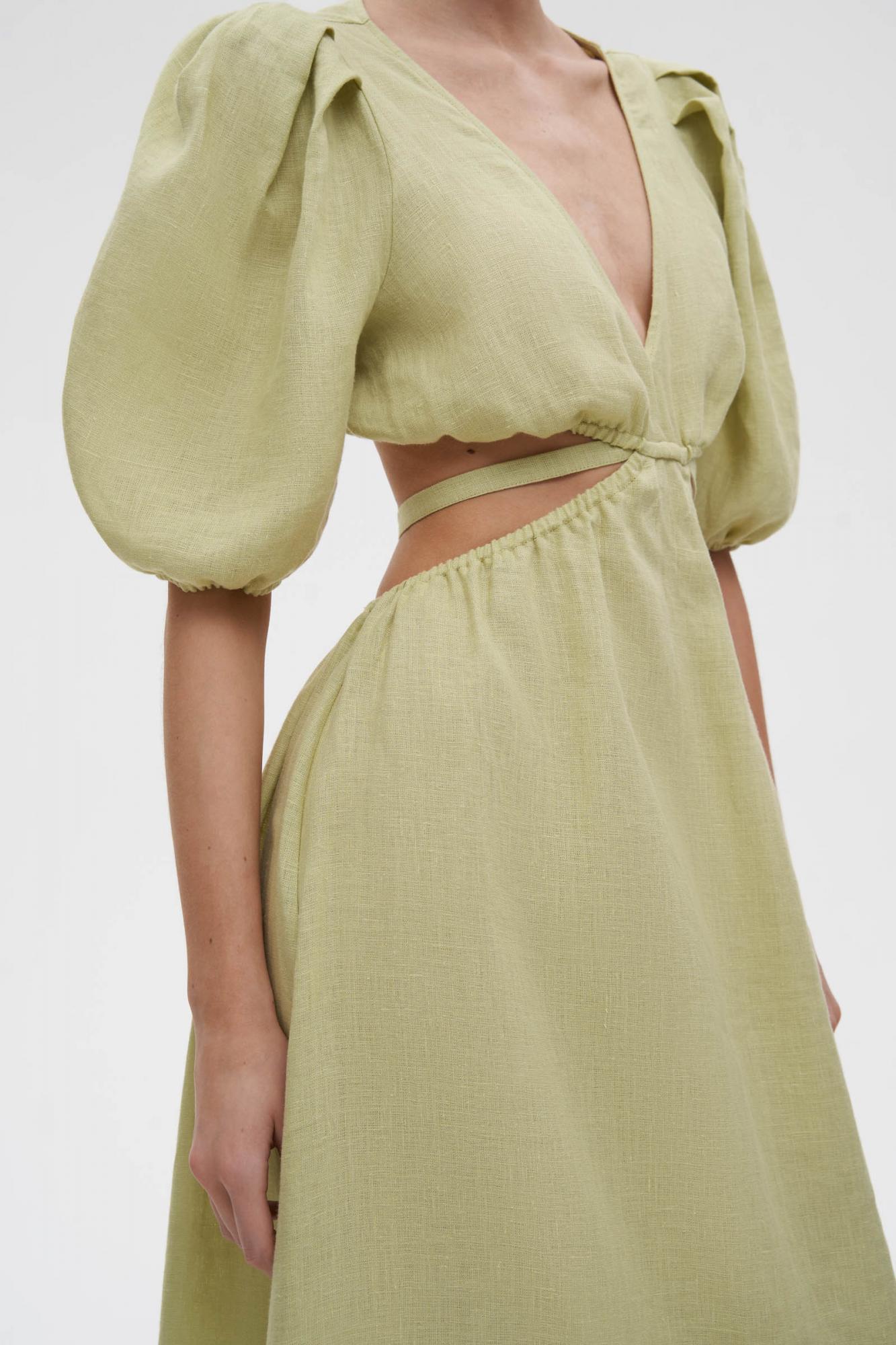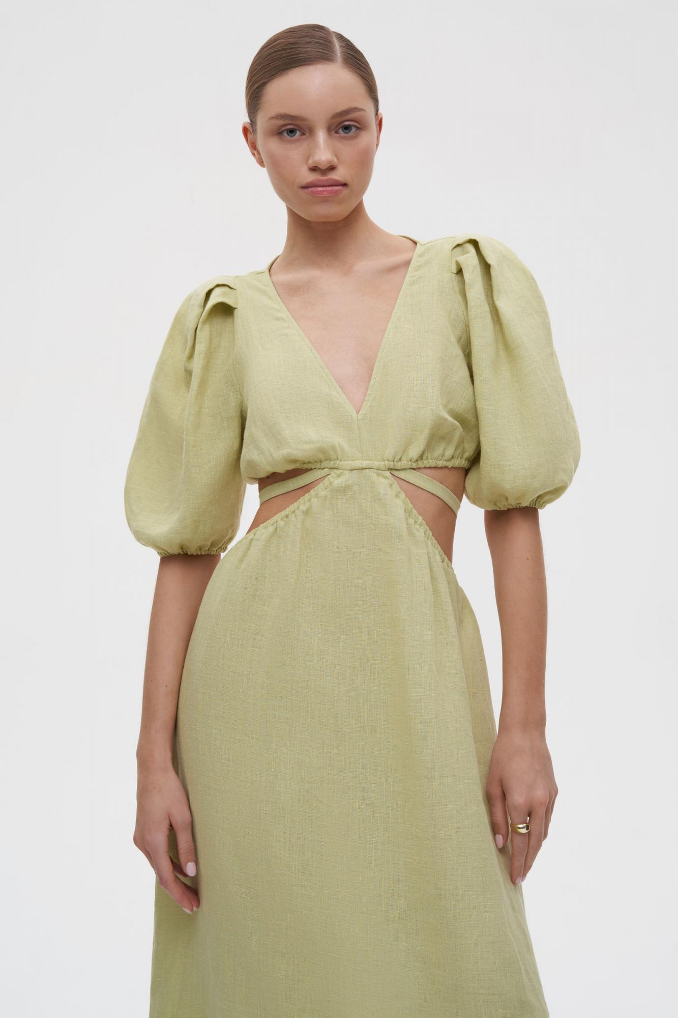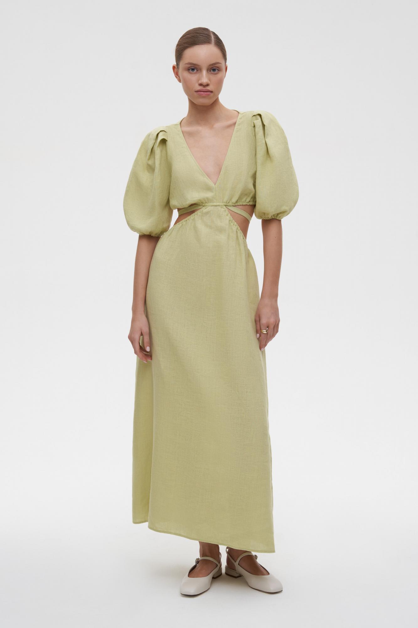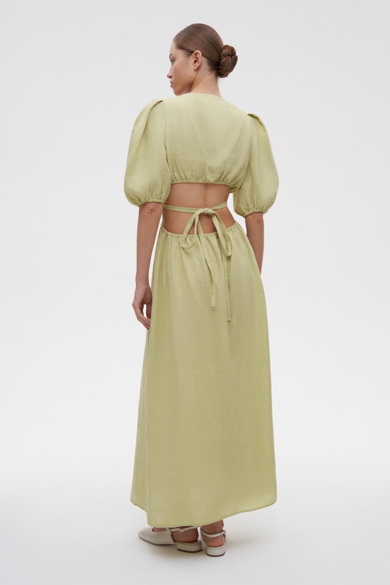 Платье миди изо льна с открытой спиной и V-образным вырезом — комфортный и красивый вариант для летнего гардероба. Приталенная модель, длина и рукава фонарики делают платье утонченным и элегантным. Благодаря тонким резинкам по талии можно комфортно зафиксировать лиф. Декоративные акцентные вырезы формируют женственный силуэт песочные часы. Изделие требует деликатного ухода, для сохранения привлекательного вида сушите в расправленном виде.