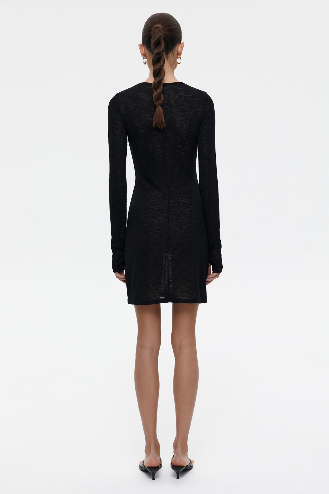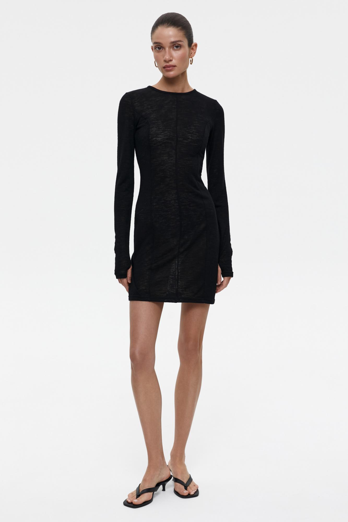 Платье длины мини из полупрозрачного трикотажа с акцентными рельефными швами, подчеркивающие изгибы фигуры. Четкая плечевая линия, аккуратный крой и круглая горловина обеспечивают комфортную посадку. Длинный рукав дополнен прорезью для большого пальца.