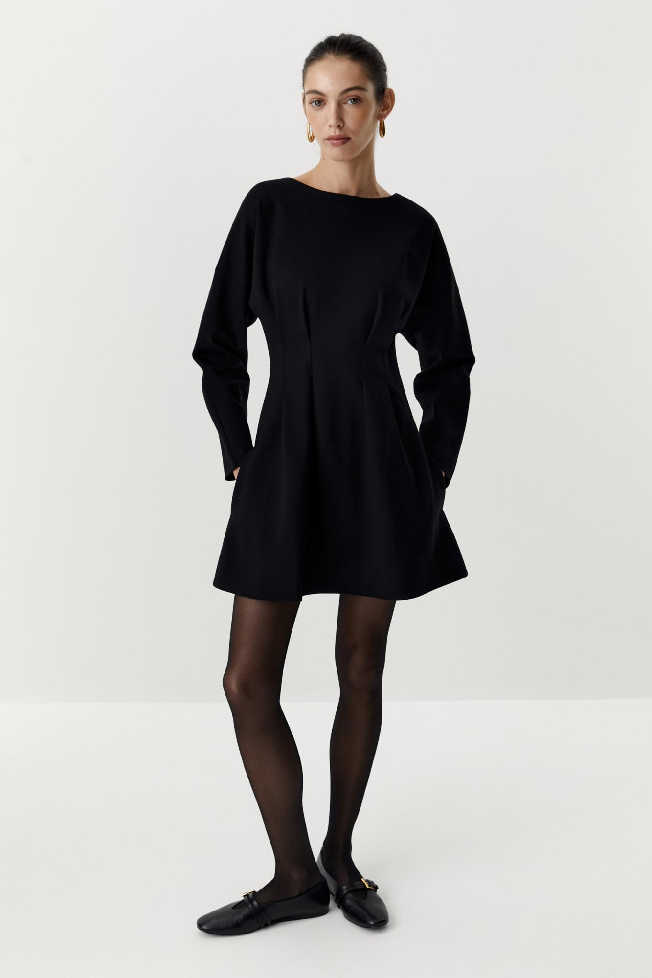 Платье мини приталенного силуэта со спущенным плечом. Модель с горловиной лодочкой и складками по талии, которые формируют силуэт песочных часов и придают образу женственности. Изделие из вискозного трикотажа, приятной на ощупь и комфортной в носке.