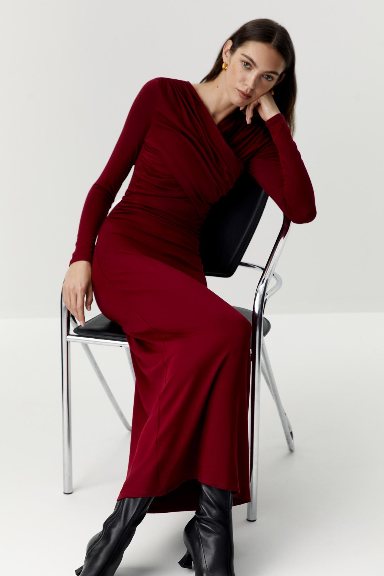 Платье облегающее с длинными рукавами длиной миди. Акцент изделия – декоративная драпировка с перекрестом по груди, которые делают базовую модель более интересной. Нежная вискоза приятна к телу, благодаря чему платье комфортно в использовании.