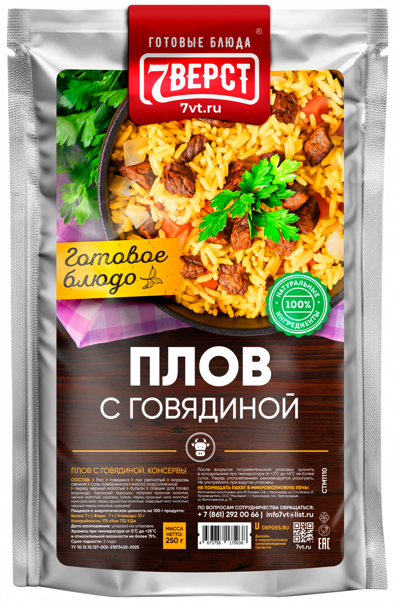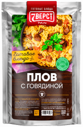 Рис, говядина, лук репчатый, морковь свежая, соль поваренная, масло растительное, вода, специи (кориандр молотый, паприка красная сладкая молотая, зира, куркума, чеснок молотый, барбарис, перец красный чили молотый, изюм, базилик, перец черный молотый, лавровый лист молотый).