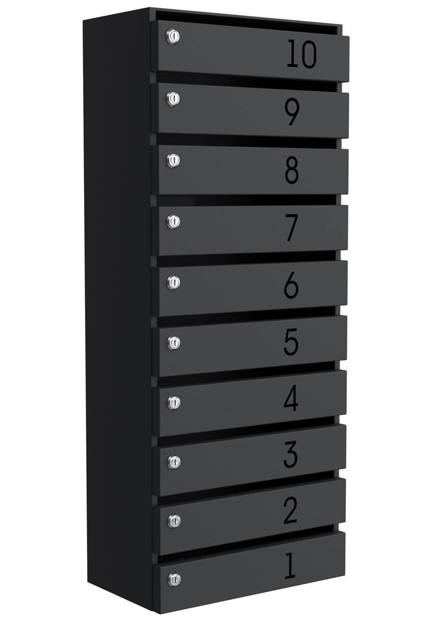 Подъездный почтовый ящик Эталон-10 – изделие на десять ячеек, предназначенное для размещения в закрытом помещении. Почтовый ящик покрашен премиальной порошковой краской, цвет черный муар RAL 9005. Толщина металла – 0,7 мм. Нумерация наносится методом сквозной лазерной резки – цифры можно заранее согласовать с производителем (шрифт по умолчанию Arial). Сварная конструкция из холоднокатаной углеродистой стали. Письма и печатную продукцию вынимают через дверцу, которая открывается сверху-вниз, запираемую на надежный замок. Дверцы имеют уникальную систему крепления, не имеющую аналогов на российском рынке. Одним из основных отличием данной серии является практически безрамочный дизайн. Купить данный почтовый ящик можно в нашем интернет-магазине. Стоимость бокса для корреспонденции – выше средней ценовой категории.