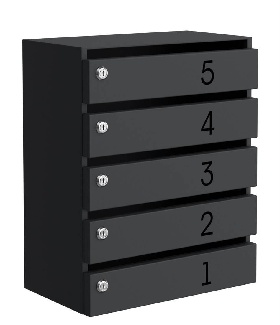 Подъездный почтовый ящик Эталон-5 – изделие, предназначенное для размещения в закрытом помещении. Почтовый ящик покрашен премиальной порошковой краской, цвет черный муар RAL 9005. Толщина металла – 0,7 мм. Нумерация наносится методом сквозной лазерной резки – цифры можно заранее согласовать с производителем (шрифт по умолчанию Arial). Сварная конструкция из холоднокатаной углеродистой стали. Письма и печатную продукцию вынимают через дверцу, которая открывается сверху-вниз, запираемую на надежный замок. Дверцы имеют уникальную систему крепления, не имеющую аналогов на российском рынке. Одним из основных отличием данной серии является практически безрамочный дизайн. Купить данный почтовый ящик можно в нашем интернет-магазине. Стоимость бокса для корреспонденции – выше средней ценовой категории.