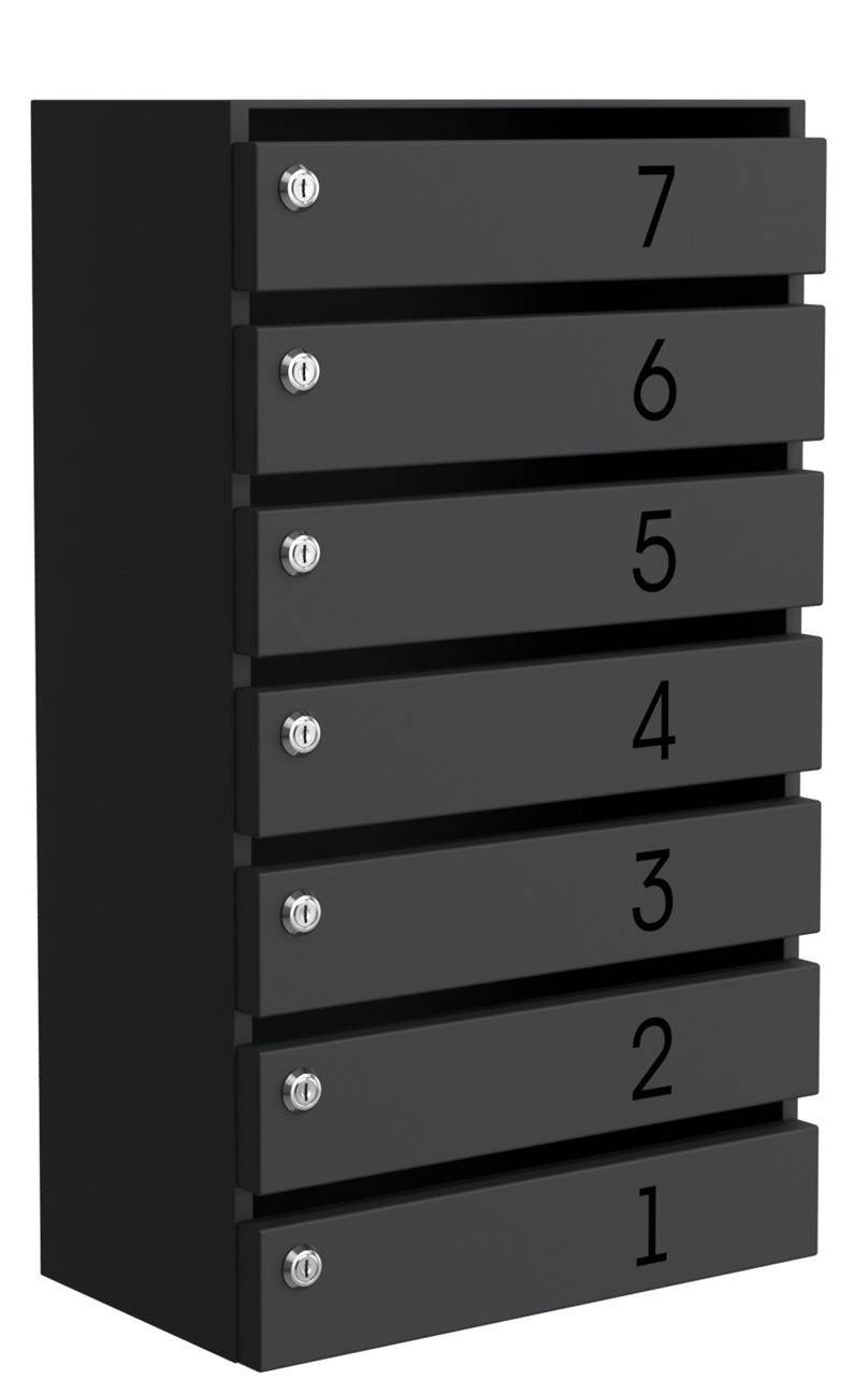 Подъездный почтовый ящик Эталон-7 – изделие на семь ячеек, предназначенное для размещения в закрытом помещении. Почтовый ящик покрашен премиальной порошковой краской, цвет черный муар RAL 9005. Толщина металла – 0,7 мм. Нумерация наносится методом сквозной лазерной резки – цифры можно заранее согласовать с производителем (шрифт по умолчанию Arial). Сварная конструкция из холоднокатаной углеродистой стали. Письма и печатную продукцию вынимают через дверцу, которая открывается сверху-вниз, запираемую на надежный замок. Дверцы имеют уникальную систему крепления, не имеющую аналогов на российском рынке. Одним из основных отличием данной серии является практически безрамочный дизайн. Купить данный почтовый ящик можно в нашем интернет-магазине. Стоимость бокса для корреспонденции – выше средней ценовой категории.