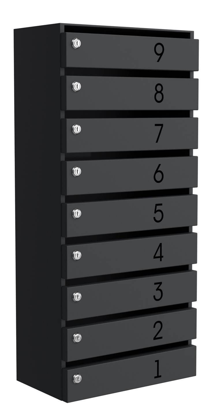 Подъездный почтовый ящик Эталон-9 – изделие на девять ячеек, предназначенное для размещения в закрытом помещении. Почтовый ящик покрашен премиальной порошковой краской, цвет черный муар RAL 9005. Толщина металла – 0,7 мм. Нумерация наносится методом сквозной лазерной резки – цифры можно заранее согласовать с производителем (шрифт по умолчанию Arial). Сварная конструкция из холоднокатаной углеродистой стали. Письма и печатную продукцию вынимают через дверцу, которая открывается сверху-вниз, запираемую на надежный замок. Дверцы имеют уникальную систему крепления, не имеющую аналогов на российском рынке. Одним из основных отличием данной серии является практически безрамочный дизайн. Купить данный почтовый ящик можно в нашем интернет-магазине. Стоимость бокса для корреспонденции – выше средней ценовой категории.