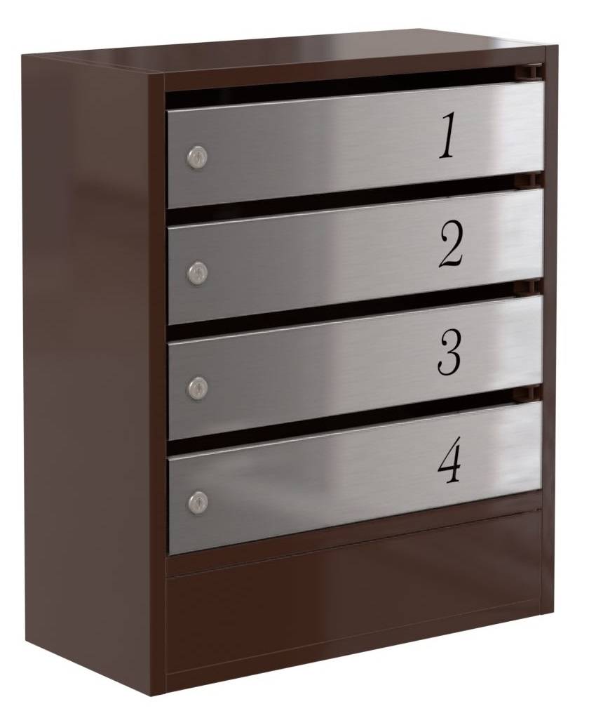 Подъездный почтовый ящик Практик-4 – изделие, предназначенное для размещения в закрытом помещении. Цвет корпуса коричневый, четыре дверцы из шлифованной нержавейки. Толщина металла – 0,8 мм. Нумерация наноситься методом лазерной гравировки – цифры можно заранее согласовать с производителем (шрифт на выбор заказчика). Сварная конструкция из холоднокатаной углеродистой стали. Письма и печатную продукцию вынимают через нержавеющую дверцу (открывается слева направо), запираемую на надежный замок. Модель имеет отличные антивандальные характеристики. Купить почтовый ящик можно в нашем интернет-магазине. Стоимость бокса для корреспонденции – выше средней ценовой категории.