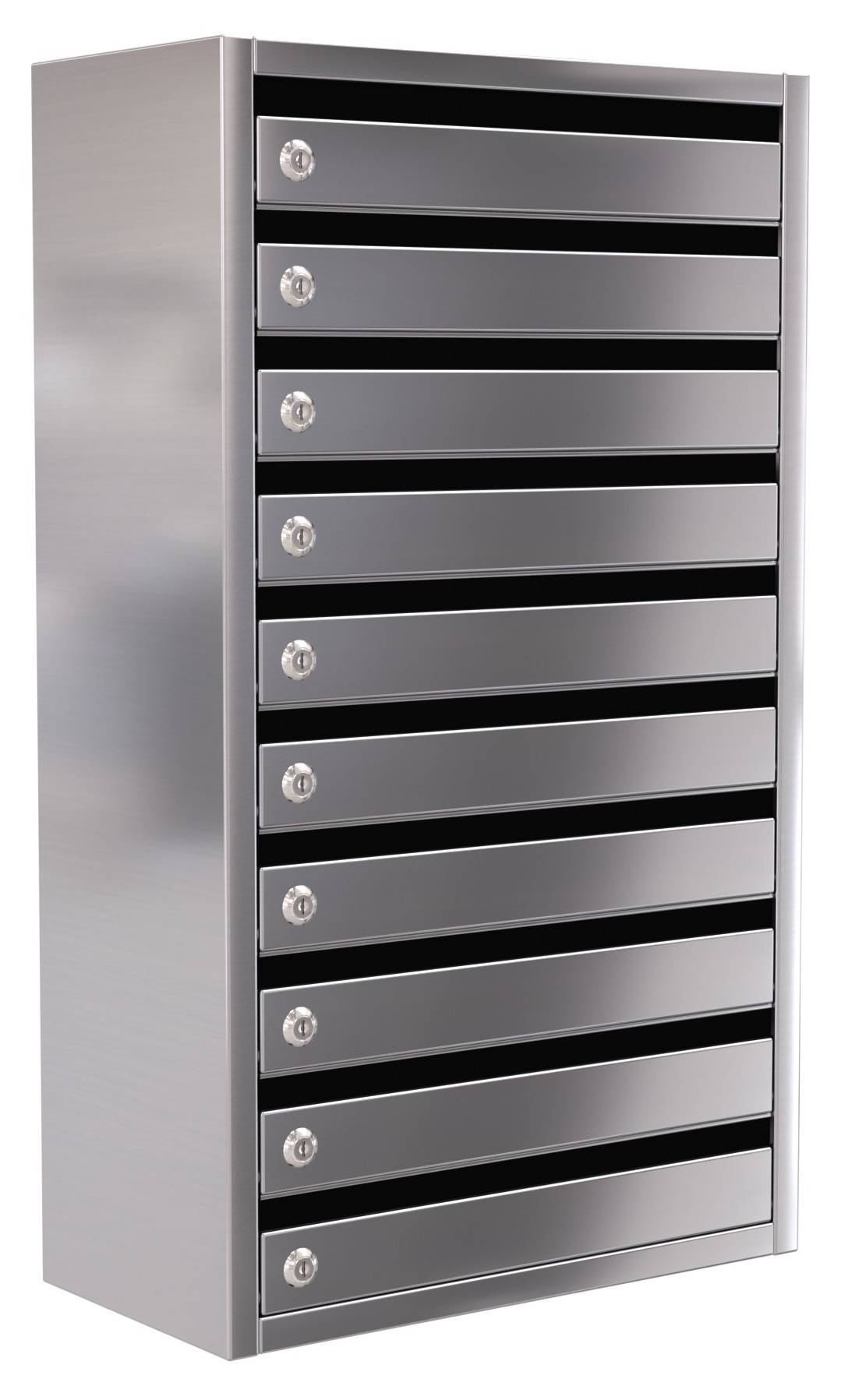 Модель Премиум 10 секций – хит продаж. Данную металлическую мебель охотно заказывают для подъездов элитных многоквартирных домов и бизнес центров. Цена почтового ящика из нержавейки – выше средней ценовой категории, т.к. корпус и дверцы полностью изготовлены из шлифованной нержавеющей стали. Изделие сварное – для жесткости предусмотрена задняя стенка, что придает ему дополнительные антивандальные свойтсва. Каждая створка оборудована ключевым замком повышенной секретности. Предложенная специализированная мебель из металла выпускается модулями с разным количеством ячеек, которые можно компоновать, создавая единый массив абонентских шкафчиков. Купить почтовый ящик Премиум класса с десятью ячейками можно в нашем интернет-магазине. Позвоните нашими менеджерами… и опытные специалисты помогут вам сделать правильный выбор.