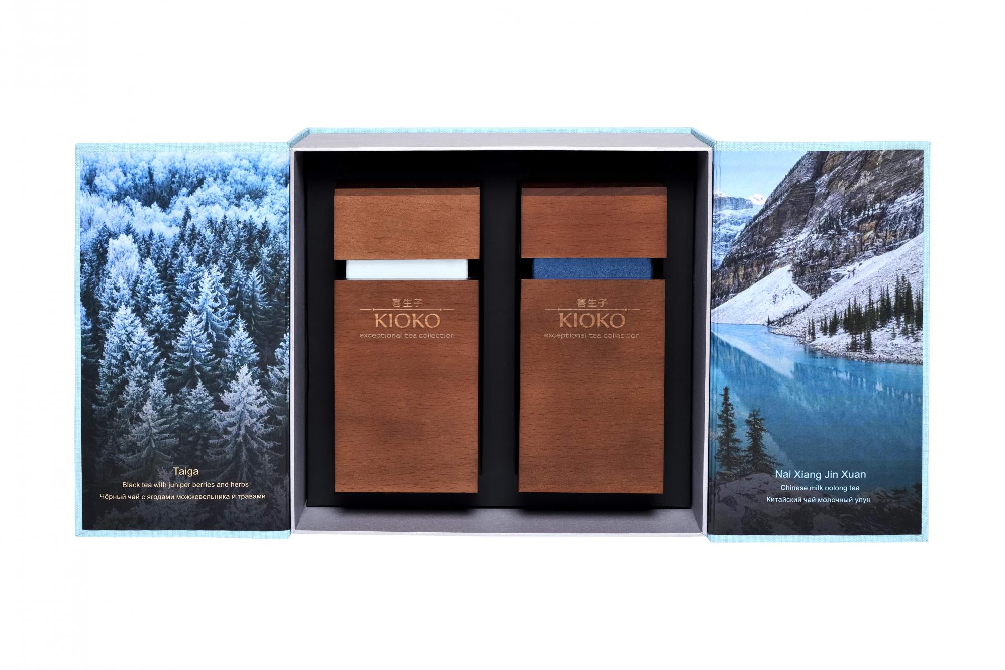 Коллекционный набор листового чая класса «премиум» в подарочной упаковке с деревянными тубусами: ароматный купаж чёрного чая с травами и ягодами можжевельника и нежный молочный улун.