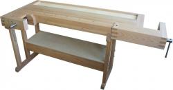 Конструкторские особенности столярных верстаков серии «Ученический» с усиленным подверстачьем позволяют разместить под столешницей дополнительную полку. Она монтируется на две имеющихся стяжных горизонтальных доски (сечением 120×40 мм). Предложенные модели отлично зарекомендовали себя, как в небольшой мастерской, так и в крупном мебельном производстве. Усиленное подверстачье представляет собой опорную раму с дополнительными элементами крепления. Стяжка каркаса - на металлических болтах.